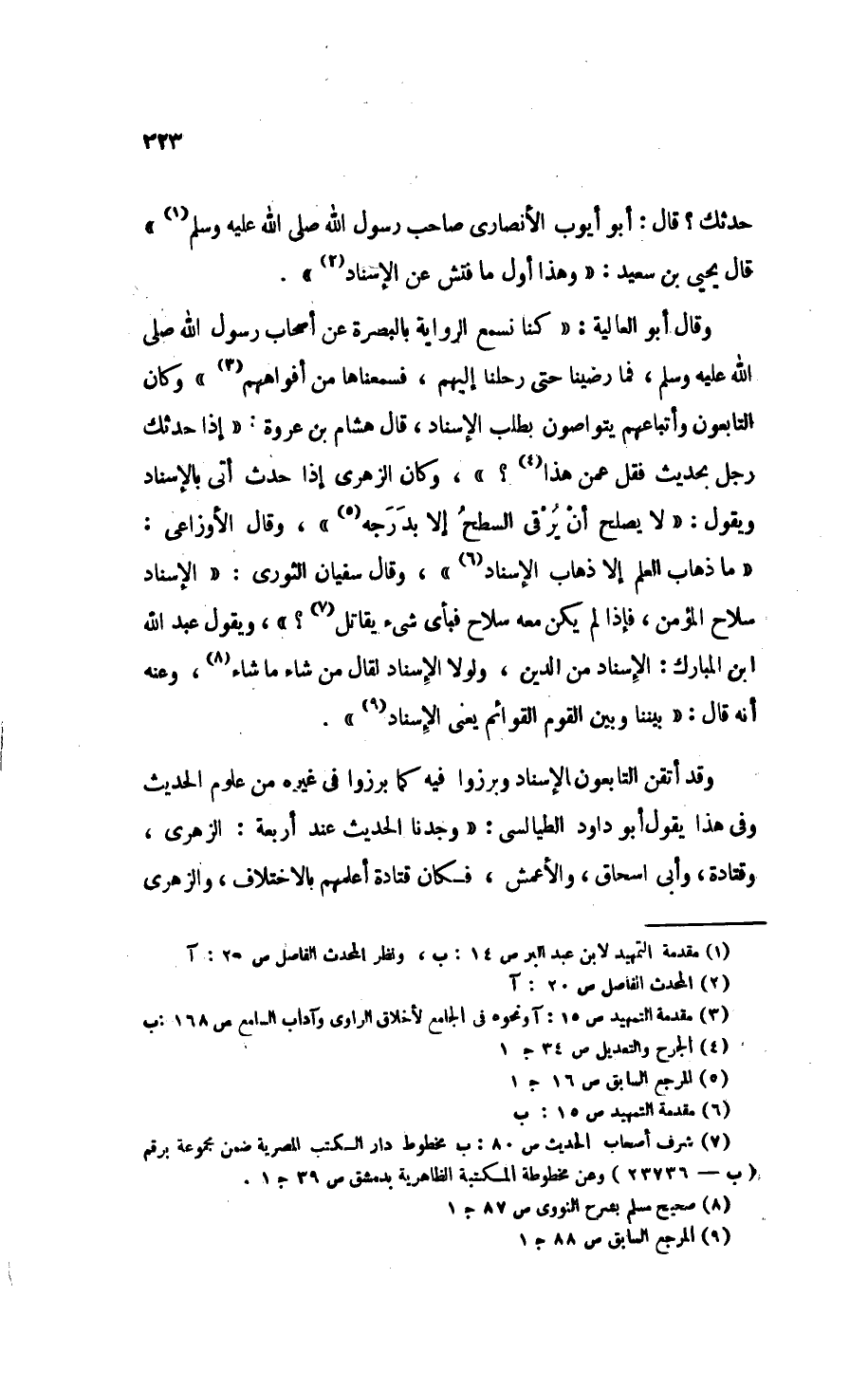 وقال أبو العالية: «كُنَّا نَسْمَعُ الرِّوَايَةَ بِالْبَصْرَةِ عَنْ أَصْحَابِ رَسُولِ اللَّهِ صَلَّى اللهُ عَلَيْهِ وَسَلَّمَ، فَمَا رَضِينَا حَتَّى رَحَلْنَا إِلَيْهِمْ، فَسَمِعْنَاهَا مِنْ أَفْوَاهِهِمْ» (¬3). وكان التابعون وأتباعهم يتواصون بطلب الإسناد، قال هشام بن عروة: «إذَا حَدَّثَكَ رَجُلٌ بِحَدِيثٍ فَقُلْ عَمَّنْ هَذَ؟» (¬4)، وكان الزهري إِذَا حَدَّثَ أَتَى بِالإِسْنَادِ وَيَقُولُ: «لاَ يَصْلُحُ أَنْ يُرْقَى السَّطْحُ إِلاَّ بِدَرَجِهِ» (¬5)، وقال الأوزاعي: «مَا ذَهَابُ العِلْمِ إِلاَّ ذَهَابُ الإِسْنَادِ» (¬6)،، وقال سفيان الثوري: «الإِسْنَادُ سِلاَحُ الْمُؤْمِنِ، فَإِذَا لَمْ يَكُنْ مَعَهُ سِلاَحٌ فَبِأَيِّ شَيْءٍ يُقَاتِلُ؟» (¬7)، ويقول عبد الله بن المبارك: «الإِسْنَادُ مِنَ الْدِّينِ، وَلَوْلاَ الإِسْنَادُ لَقَالَ مَنْ شَاءَ مَا شَاءَ» (¬8)، وعنه أنه قال: «بَيْنَنَا وَبَيْنَ القَوْمِ القَوَائِمُ» يَعْنِي الإِسْنَادَ. (¬9).