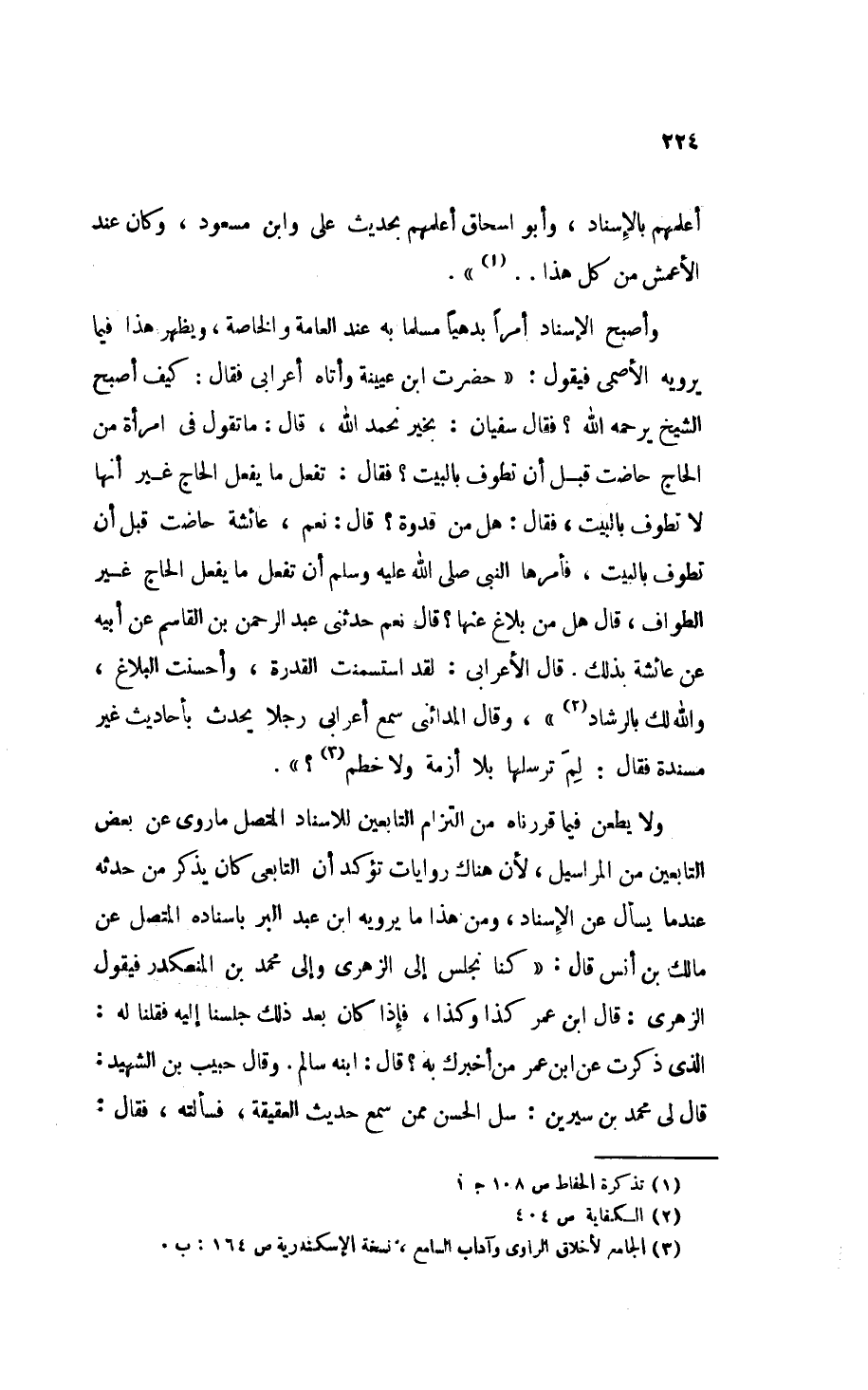 وأصبح الإسناد أَمْرًا بَدَهِيًّا مُسَلَّمًا به عند العامة والخاصة، ويظهر هذا فيما يرويه الأصمعي فيقول: «حَضَرْتُ ابْنَ عُيَيْنَةَ وَأَتَاهُ أَعْرَابِيٌّ فَقَالَ: كَيْفَ أَصْبَحَ الشَّيْخُ يَرْحَمُهُ اللَّهُ؟ فَقَالَ سُفْيَانُ: بِخَيْرٍ نَحْمَدُ اللَّهَ، قَالَ: مَا تَقُولُ فِي امْرَأَةٍ مِنَ الحَاجِّ حَاضَتْ قَبْلَ أَنْ تَطُوفَ بِالبَيْتِ؟ فَقَالَ: تَفْعَلُ مَا يَفْعَلُ الحَاجُّ , غَيْرَ أَنَّهَا لاَ تَطُوفُ بِالبَيْتِ , فَقَالَ: هَلْ مِنْ قُدْوَةٍ؟ قَالَ: نَعَمْ «عَائِشَةُ حَاضَتْ قَبْلَ أَنْ تَطُوفَ بِالبَيْتِ , فَأَمَرَهَا النَّبِيُّ صَلَّى اللهُ عَلَيْهِ وَسَلَّمَ أَنْ تَفْعَلَ مَا يَفْعَلُ الحَاجُّ غَيْرَ الطَّوَافِ» , قَالَ: هَلْ مِنْ بَلاَغٍ عَنْهَا؟ قَالَ: نَعَمْ , حَدَّثَنِي عَبْدُ الرَّحْمَنِ بْنُ الْقَاسِمِ عَنْ أَبِيهِ عَنْ عَائِشَةَ بِذَلِكَ. قَالَ الأَعْرَابِيٌّ: لَقَدِ اسْتَسْمَنْتَ القُدْوَةَ , وَأَحْسَنْتَ البَلاَغَ , وَاللَّهُ لَكَ بِالرَّشَادِ» (¬2)، وقال المدائني سمع أعرابي رجلاً يحدث بأحاديث غير مسندة فقال: «لِمَ تُرْسِلُهَ بِلاَ أَزِمََّةُ وَلاَ خَطْمِ (¬3)؟».
