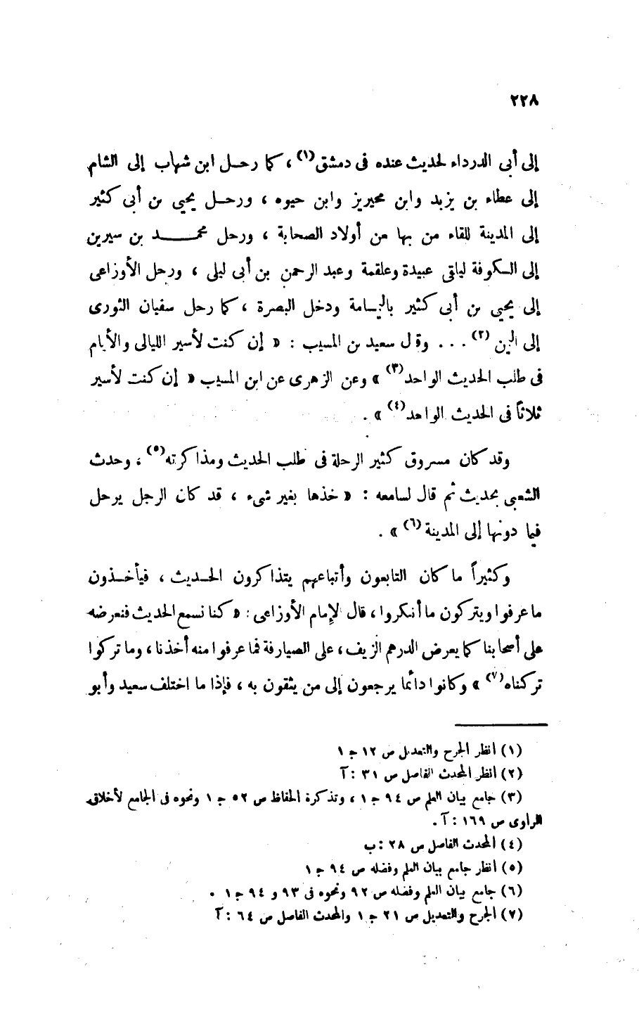 إلى أبي الدرداء لحديث عنده في دمشق (¬1) كما رحل ابن شهاب إلى الشام إلى عطاء بن يزيد وابن مُحيريز وابن حَيْوَهْ، ورحل يحيى بن أبي كثير إلى المدينة للقاء من بها من أولاد الصحابة، ورحل محمد بن سيرين إلى الكوفة ليلقى عبيدة وعلقمة وعبد الرحمن بن أبي ليلى، ورحل الأوزاعي إلى يحيى بن أبي كثير باليمامة ودخل البصرة، كما رحل سفيان الثوري إلى اليمن (¬2) ... وقال سعيد بن المسيب: «إِنْ كُنْتُ لأَسِيرُ اللَّيَالِيَ وَالأَيَّامَ فِي طَلَبِ الحَدِيثِ الوَاحِدِ» (¬3). وعن الزهري عن ابن المسيب: «إِنْ كُنْتُ لأَسِيرُ ثَلاَثًا فِي الحَدِيثِ الوَاحِدِ» (¬4).