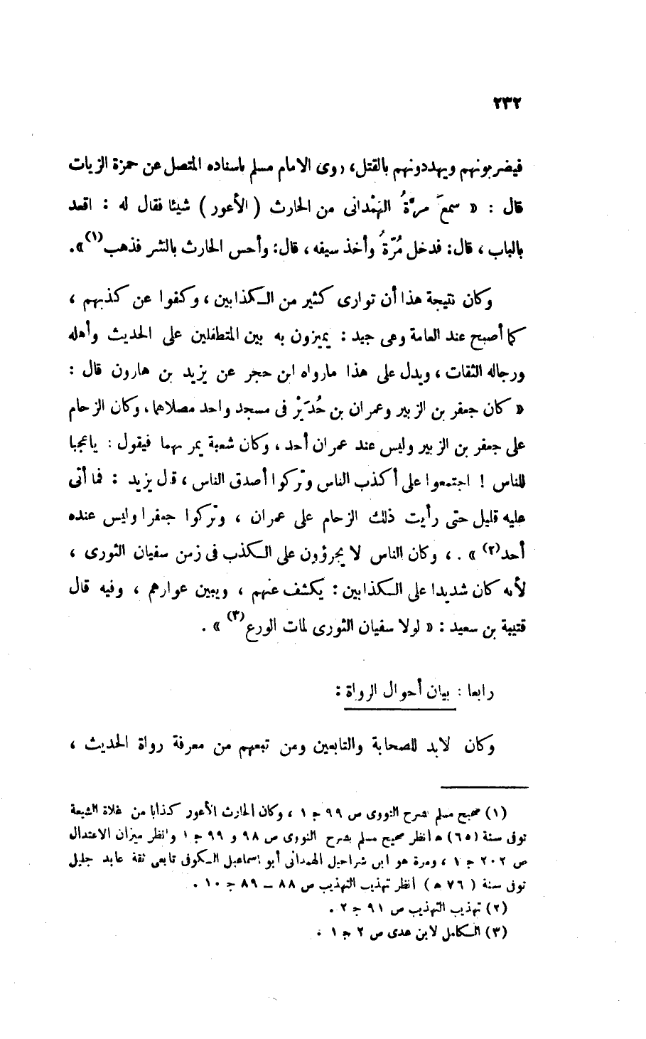 (¬1) " صحيح مسلم بشرح النووي ": ص 99 جـ 1، وكان الحارث الأعور كذابًا من غلاة الشيعة، توفي سَنَةَ (65 هـ)، انظر " صحيح مسلم بشرح النووي ": ص 98 و 99 جـ 1، وانظر " ميزان الاعتدال ": ص 202 جـ 1، ومُرَّةُ بْنُ شَرَاحِيلَ الهَمْدَانِيُّ، أبو إسماعيل الكوفي تابعي ثقة عابد جليل توفي سَنَةَ (76 هـ)، انظر " تهذيب التهذيب ": ص 88، 89 جـ 10.