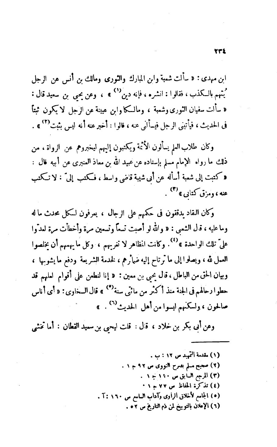 وكان النقاد يدققون في حكمهم على الرجال، يعرفون لكل محدث ما له وما عليه، قال الشعبي: «وَاللهِ لَوْ أَصَبْتُ تِسْعًا وَتِسْعِينَ مَرََّةٍ، وَأَخْطَأْتُ مَرََّةً لَعَدُّوا عَلَيَّ تِلْكَ الوَاحِدَةَ» (¬4). وكانت المظاهر لا تغريهم، وكل ما يهمهم أن يخلصوا العمل لله، ويصلوا إلى ما ترتاح إليه ضمائرهم، لخدمة الشريعة ودفع ما يشوبها، وبيان الحق من الباطل، قَالَ يَحْيَى بْنَ مَعِينٍ: «إِنَّا لَنَطْعُنُ عَلَى أَقْوَامٍ لَعَلَّهُمْ قَدْ حَطُّوا رِحَالَهُمْ فِي الجَنَّةِ مُنْذُ أَكْثَرَ مِنْ مِائَتَيْ سَنَةٍ» (¬5). قال السخاوي: «أَيْ أَنَاسٌ صَالِحُونَ، وَلَكِنَّهُمْ لَيْسُوا مِنْ أَهْلِ الحَدِيثِ» (¬6).