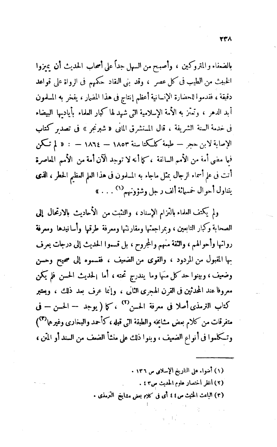 بالضعفاء والمتروكين، وأصبح من السهل جِدًّا على أصحاب الحديث أن يميزوا الخبيث من الطيب في كل عصر، وقد بنى النقاد حكمهم في الرواة على قواعد دقيقة، فقدموا للحضارة الإنسانية أعظم إنتاج في هذا المضمار، يفخر به المسلمون أبد الدهر، وتعتز به الأمة الإسلامية التي شهد لها كبار العلماء بأياديها البيضاء في خدمة السنة النبوية، قال المستشرق الألماني «شبرنجر» في تصدير كتاب " الإصابة " لابن حجر - طبعة كلكتا سَنَةَ 1853 - 1864: «لَمْ تَكُنْ فِيمَا مَضَى أُمَّةٌ مِنَ الأُمَمِ السَّالِفَةِ، كَمَا أَنَّهُ لاَ تُوجَدُ الآنَ أُمَّةٌ مِنَ الأُمَمِ المُعَاصَرَةِ أَتَتْ فِي عِلْمِ أَسْمَاءِ الرِّجَالِ بِمِثْلِ مَا جَاءَ بِهِ المُسْلِمُونَ فِي هَذَا العِلْمِ العَظِيمِ الخَطِرِ الذِي يَتَنَاوَلُ أَحْوَالَ خَمْسَمِائَةِ أَلْفِ رَجُلٍ وَشُؤُونِهِمْ ... » (¬1).