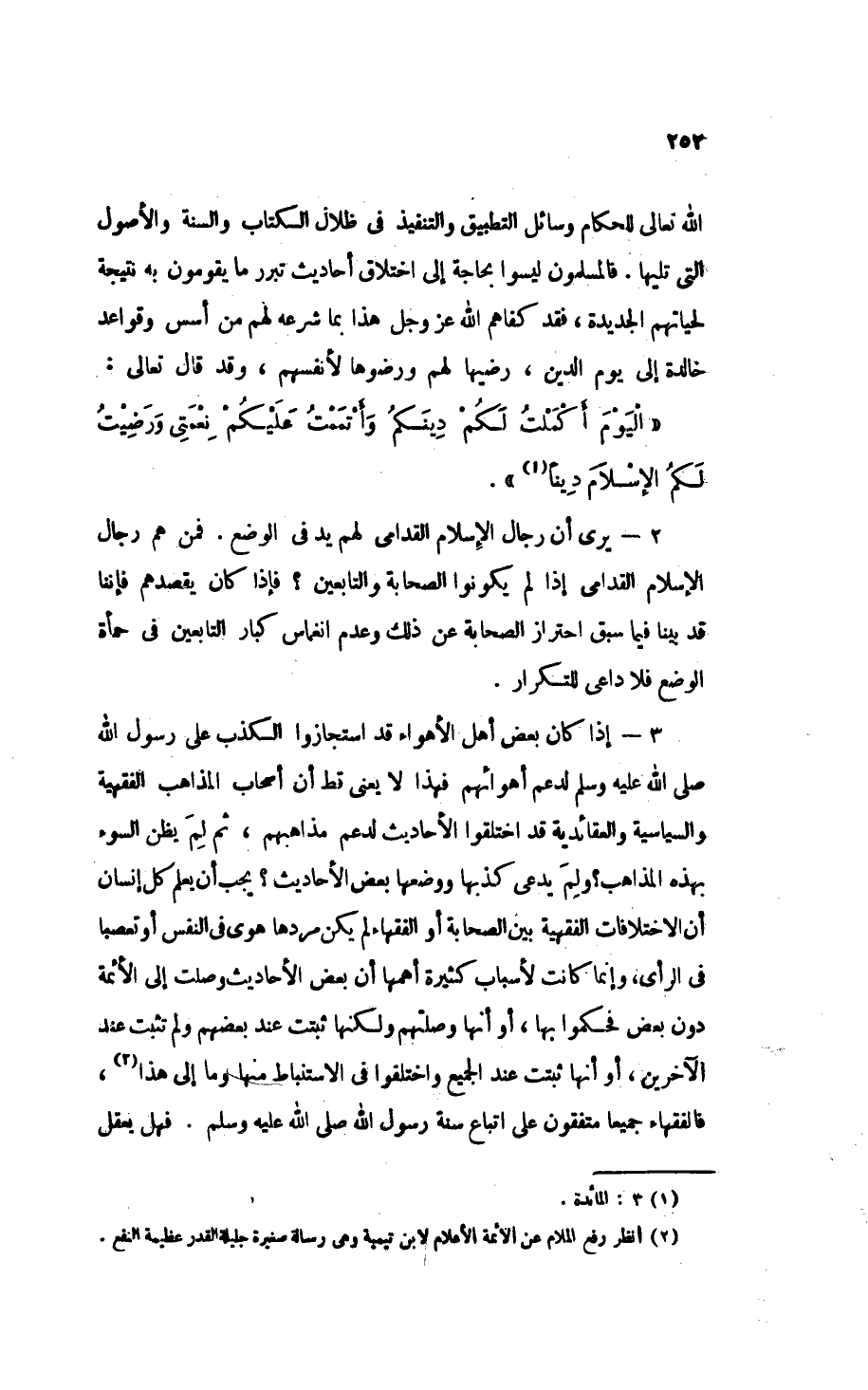 الله تعالى للحكام وسائل التطبيق والتنفيذ في ظلال الكتاب والسنة والأصول التي تليها. فالمسلمون ليسوا بحاجة إلى اختلاق أحاديث تبرر ما يقومون به نتيجة لحياتهم الجديدة، فقد كفاهم الله - عَزَّ وَجَلَّ - هذا بما شرعه لهم من أسس وقواعد خالدة إلى يوم الدين، رضيها لهم ورضوها لأنفسهم، وقد قال تعالى: {الْيَوْمَ أَكْمَلْتُ لَكُمْ دِينَكُمْ وَأَتْمَمْتُ عَلَيْكُمْ نِعْمَتِي وَرَضِيتُ لَكُمُ الإِسْلاَمَ دِينًا} (¬1).