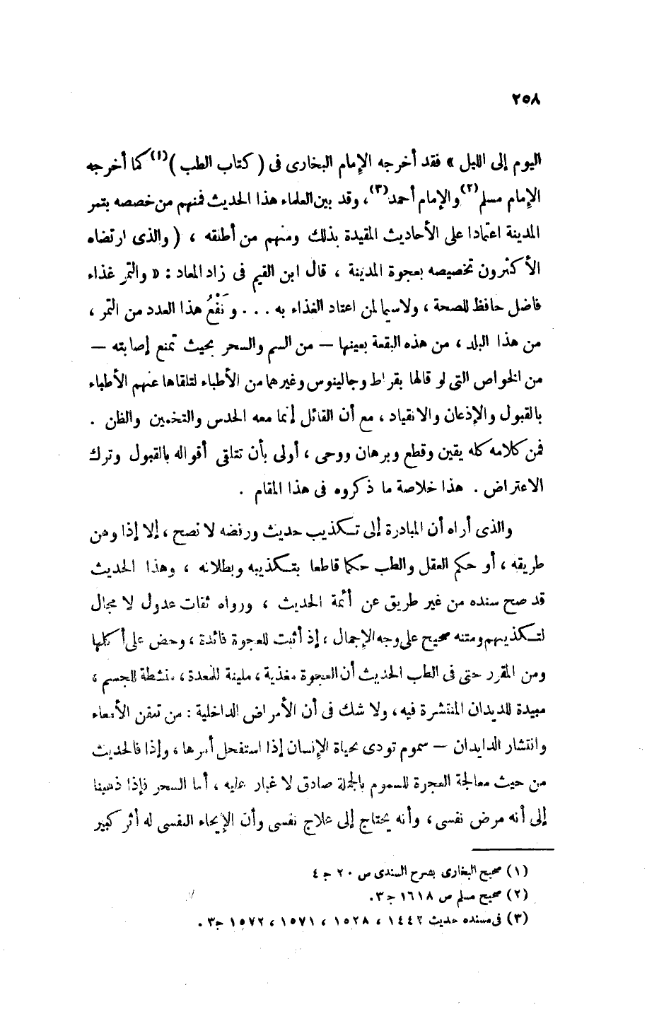 «هَذَا خُلاَصَةُ مَا ذَكَرُوهُ فِي هَذَا المَقَامِ، وَالذِي أَرَاهُ أَنَّ المُبَادَرَةَ إِلَى تَكْذيبِ حَديثٍ وَرَفْضِهِ لاَ تَصِحُّ، إلاَّ إذَا وَهُنَ طَرِيقَهُ، أَوْ حَكَمَ العَقْلُ وَالطُّبُّ حُكْمًا قَاطِعًا بِتَكْذيبِهِ وَبُطْلاَنِهِ، وَهَذَا الحَديثُ قَدْ صَحَّ سَنَدُهُ مِنْ غَيْرِ طَرِيقِ عَنْ أَئِمَّةِ الحَديثِ، وَرَوَاهُ ثِقَاتٌ عُدُولٌ لاَ مَجَالَ لِتَكْذِيبِهِمْ وَمَتْنُهُ صَحِيحٌ عَلَى وَجْهِ الإِجْمَالِ، إِذْ أَثَبْتَ لِلْعَجْوَةِ فَائِدَةً، وَحَضَّ عَلَى أَكْلِهَا، وَمِنَ المُقَرَّرِ حَتَّى فِي الطُّبِّ الحَديثِ أَنْ العَجْوَةَ مُغَذِّيَةٌ، مُلَيِّنَةٌ لِلْمَعِدَةِ، مُنَشَّطَةٌ لِلْجِسْمِ، مُبِيدَةٌ لِلْدِّيدَانِ المُنْتَشِرَةِ فِيهِ، وَلاَ شَكَّ أَنَّ الأَمْرَاضَ الدَّاخِلِيَّةََ مِنْ تَعَفُّنِ الأَمْعَاءِ وَاِنْتِشارِ الدِّيدَانِ، سُمُومٌ تُودِي بِحَيَاةِ الإِنْسَانِ إِذَا اِسْتَفْحَلَ أَمْرُهَا. وَإذًا فَالحَديثُ مِنْ حَيْثُ مُعَالَجَةِ العَجْوَةِ لِلْسُمُومِ بِالجُمَلَةِ، صَادِقٌ لاَ غُبَارَ عَلَيْهِ. أَمَا السِّحْرُ فَإذَا ذَهَبْنَا إِلَى أَنَّهُ مَرَضٌ نَفْسِيٌّ، وَأَنَّه يَحْتَاجُ إِلَى عِلاَجِ نَفْسِيٌّ، وَأَنَّ الإِيحَاءَ النَّفْسِيَّ لَهُ أَثَرٌ كَبِيرٌ