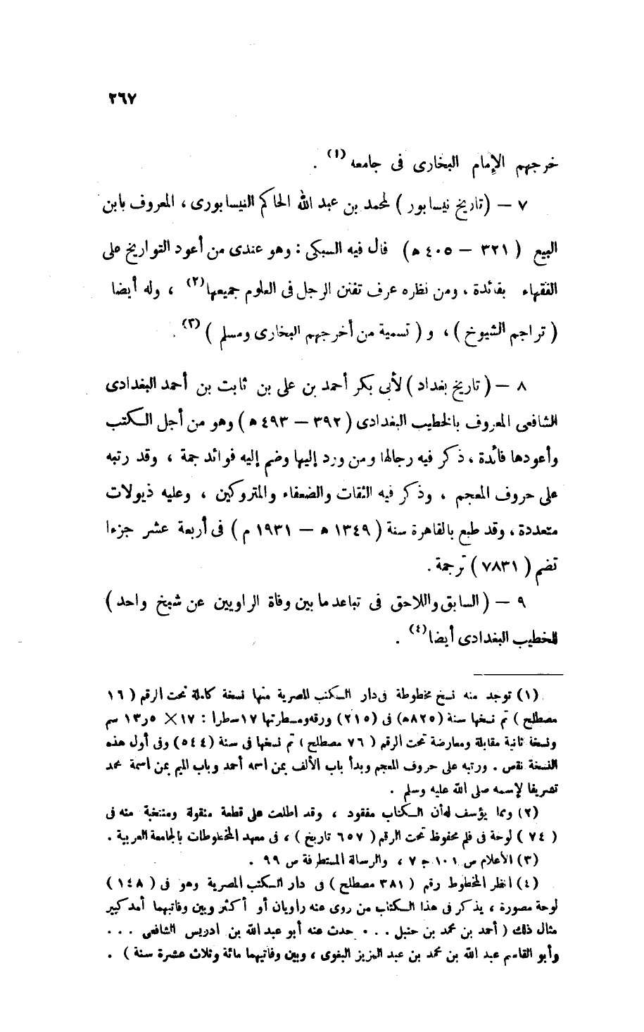 7 - " تاريخ نيسابور " لمحمد بن عبد الله الحاكم النيسابوري، المعروف بابن البيع (321 - 405 هـ) قال فيه السبكي: «وَهُوَ عِنْدِي مِنْ أَعْوَدِ التَّوَارِيخِ عَلَى الفُقَهَاءِ بِفَائِدَةٍ، وَمَنْ نَظَرَهُ عَرَفَ تَفَنُّنَ الرَّجُلِ فِي العُلُومِ جَمِيعِهَا» (¬2)، وله أَيْضًا " تراجم الشيوخ "، و " تسمية من أخرجهم البخاري ومسلم " (¬3).