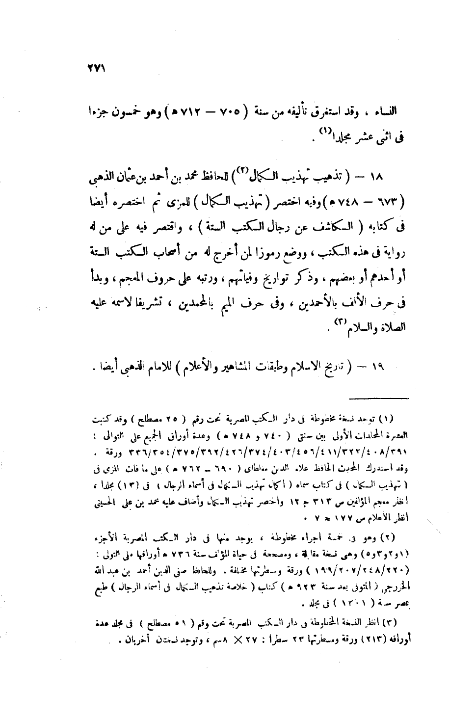 18 - " تذهيب تهذيب الكمال " (¬2) للحافظ محمد بن أحمد بن عثمان الذهبي (673 - 748 هـ) وفيه اختصر " تهذيب الكمال " لِلْمِزِّي ثم اختصره أَيْضًا في كتابه " الكاشف عن رجال الكتب الستة "، واقتصر فيه على من له رواية في هذه الكتب، ووضع رُمُوزًا لمن أخرج له من أصحاب " الكتب الستة " أو أحدهم أو بعضهم، وذكر تواريخ وفياتهم، ورتبه على حروف المعجم، وبدأ في حرف الألف بالأحمدين، وفي حرف الميم بالمحمدين، تَشْرِيفًا لاسمه - عَلَيْهِ الصَلاَةُ وَالسَّلاَمُ - (¬3).