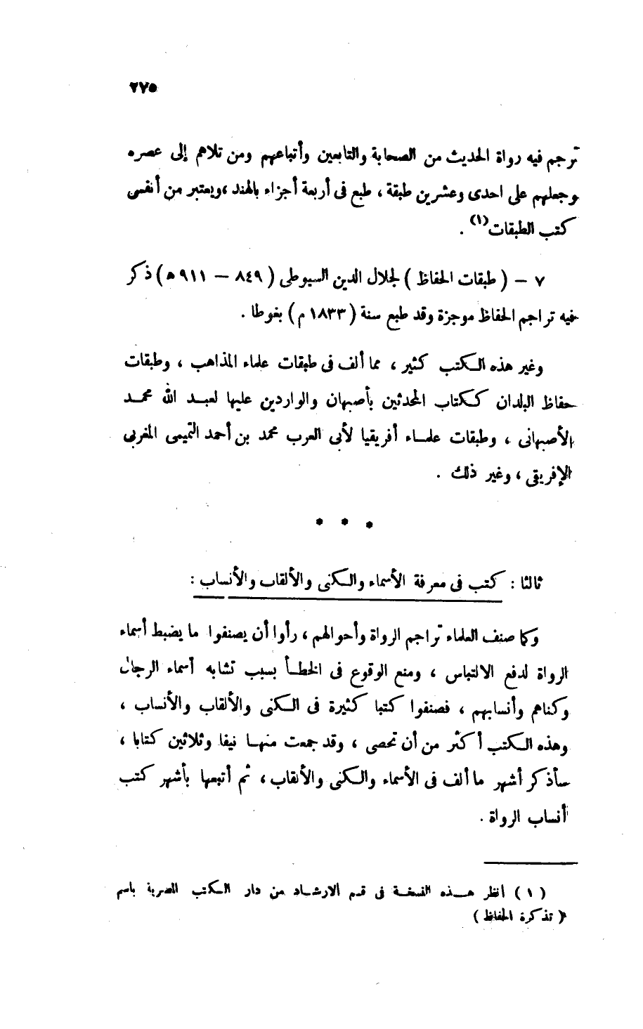 7 - " طبقات الحفاظ " لجلال الدين السيوطي (849 - 911 هـ) ذكر فيه تراجم الحفاظ موجزة وقد طبع سَنَةَ (1833 م) بغوطا.