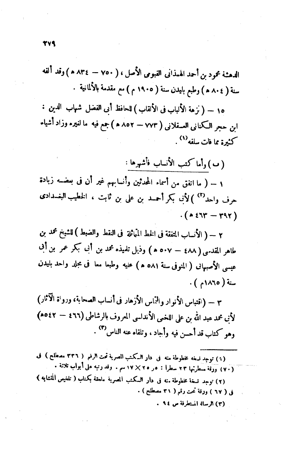 2 - " الأنساب المتفقة في الخط المتماثلة في النقط والضبط " للشيخ محمد بن طاهر المقدسي (488 - 507 هـ) وَذَيَّلَ تلميذه محمد بن أبي بكر عمر بن أبي عيسى الأصبهاني (المُتَوَفَّى سَنَةَ 581 هـ) عليه وَطُبِعَا مَعًا في مجلد واحد بليدن سَنَةَ (1865 م).