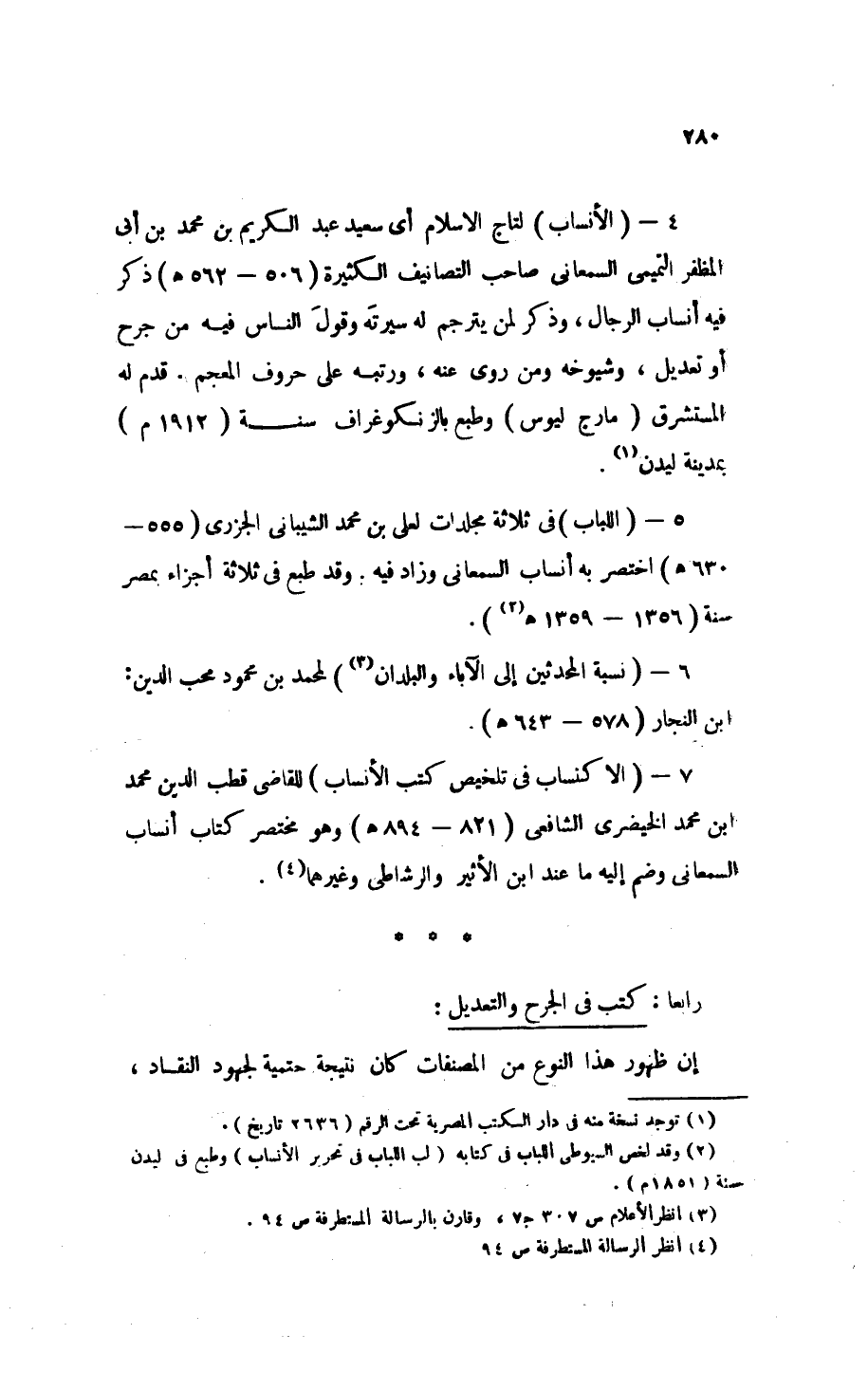 4 - " الأنساب " لتاج الإسلام [أبي سعد] عبد الكريم بن محمد بن أبي المظفر التميمي السمعاني صاحب التصانيف الكثيرة (506 - 562 هـ) ذكر فيه أنساب الرجال، وذكر لمن يترجم له سيرته وقول الناس فيه من جرح أو تعديل، وشيوخه ومن روى عنه، ورتبه على حروف المعجم. قدم له المستشرق (مارجليوث) وطبع بالزنكوغراف سَنَةَ (1912 م) بمدينة ليدن (¬1).