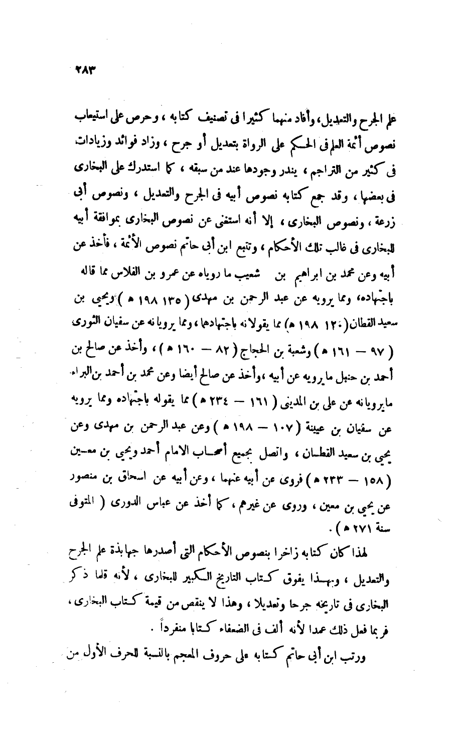 علم الجرح والتعديل، وأفاد منهما كثيرًا في تصنيف كتابه، وحرص على استيعاب نصوص أئمة العلم في الحكم على الرواة بتعديل أو جرح، وزاد فوائد وزيادات في كثير من التراجم، يندر وجودها عند من سبقه، كما استدرك على البخاري في بعضها، وقد جمع كتابه نصوص أبيه في الجرح والتعديل، ونصوص أبي زرعة، ونصوص البخاري، إلا أنه استغنى عن نصوص البخاري بموافقة أبيه للبخاري في غالب تلك الأحكام، وتتبع ابن أبي حاتم نصوص الأئمة، فأخذ عن أبيه وعن محمد بن إبراهيم بن شعيب ما روياه عن عمرو بن الفلاس مما قاله باجتهاده، ومما يرويه عن عبد الرحمن بن مهدي (135 - 198 هـ) ويحيى بن سعيد القطان (120 - 198 هـ) مما يقولانه باجتهادهما، ومما يرويانه عن سفيان الثوري (97 - 161 هـ) وشعبة بن الحجاج (82 - 160 هـ)، وأخذ عن صالح بن أحمد بن حنبل ما يرويه عن أبيه، وأخذ عن صالح أَيْضًا وعن محمد بن أحمد بن البراء ما يرويانه عن علي بن المديني (161 - 234 هـ) مما يقوله باجتهاده ومما يرويه عن سفيان بن عيينة (107 - 198 هـ) وعن عبد الرحمن بن مهدي وعن يحيى بن سعيد القطان، واتصل بجميع أصحاب الإمام أحمد ويحيى بن معين (158 - 233 هـ) فروى عن أبيه عنهما، وعن أبيه عن إسحاق بن منصور عن يحيى بن معين، وروى عن غيرهم، كما أخذ عن عباس الدوري (المُتَوَفَّى سَنَةَ 271 هـ).