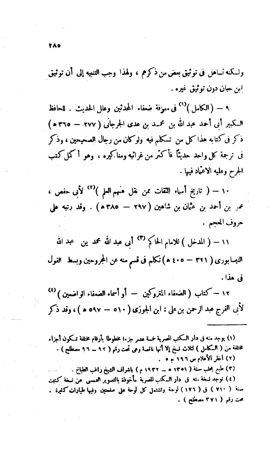 11 - " المدخل " للإمام الحاكم (¬3) أبي عبد الله محمد بن عبد الله النيسابوري (321 - 405 هـ) تكلم في قسم منه عن المجروحين وبسط القول في هذا.