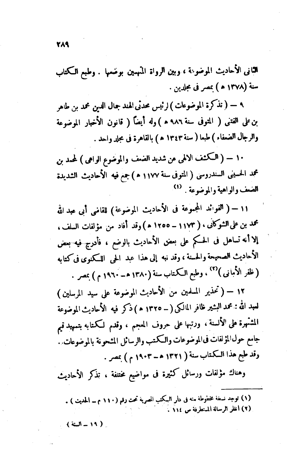 9 - " تذكرة الموضوعات " لرئيس مُحَدِّثِي الهند جمال الدين بن طاهر بن علي الفتني (المُتَوَفَّى سَنَةَ 986 هـ) وله أَيْضًا " قانون الأخبار الموضوعة والرجال الضعفاء " طُبِعَا (سَنةَ 1343 هـ) بالقاهرة في مجلد واحد.
