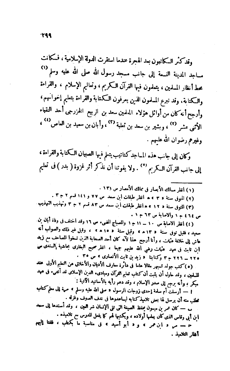 وكان إلى جانب هذه المساجد كتاتيب يتعلم فيها الصبيان الكتابة والقراءة إلى جانب القرآن الكريم (¬5). ولا يفوتنا أن نذكر أثر غزوة (بدر) في تعليم