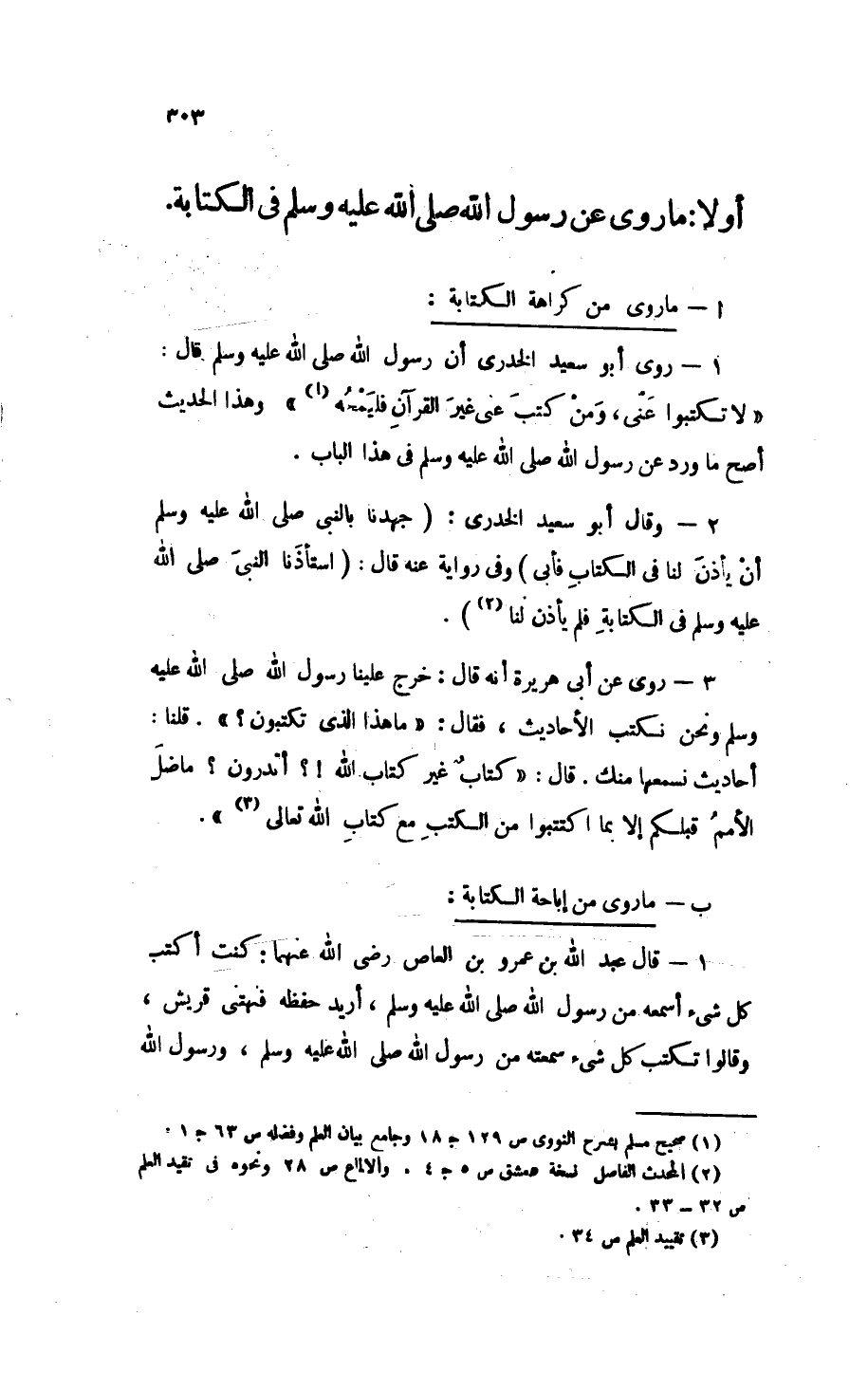1 - روى أَبُو سَعِيدٍ الخُدْرِيِّ أَنَّ رَسُولَ اللهِ - صَلََّى اللهُ عَلَيْهِ وَسَلَّمَ - قال: «لاَ تَكْتُبُوا عَنِّي، وَمَنْ كَتَبَ عَنِّي غَيْرَ القُرْآنِ فَلْيَمْحُهُ» (¬1). وهذا الحديث أصح ما ورد عن رسول الله - صَلََّى اللهُ عَلَيْهِ وَسَلَّمَ - في هذا الباب.