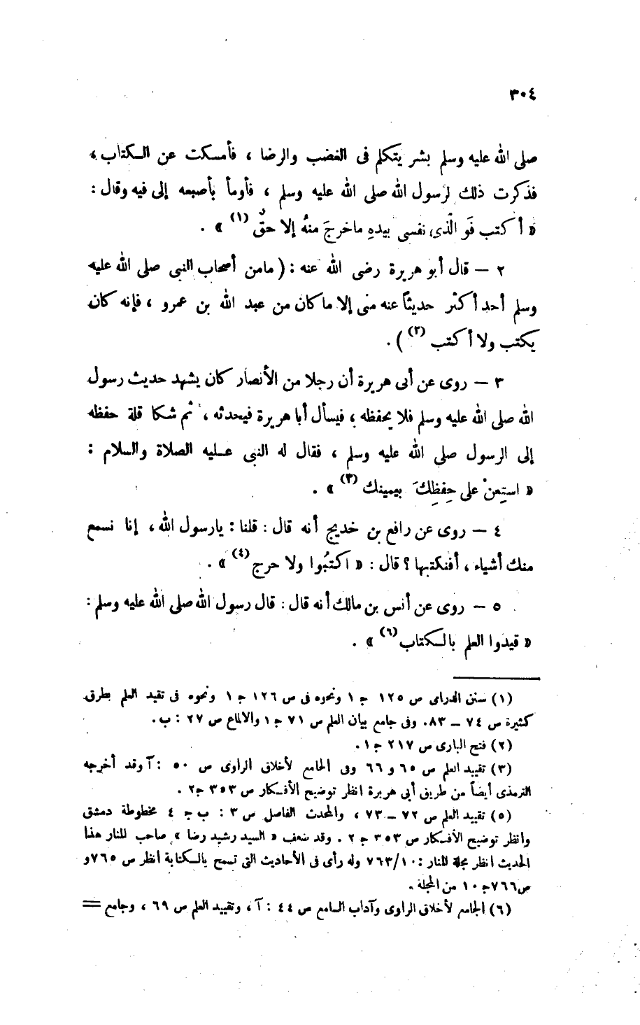 (¬4) " تقييد العلم ": ص 72، 73. و" المحدث الفاصل ": ص 3: ب، جـ 4 مخطوطة دمشق. وانظر " توضيح الأفكار ": ص 353 جـ 2. وقد ضَعَّفَ «السيد رشيد رضا» صاحب " المنار " هذا الحديث، انظر مجلة " المنار ": 10/ 763 وله رأي في الأحاديث التي تسمح بالكتابة، انظر ص 765 و 766 جـ 10 من المجلة.