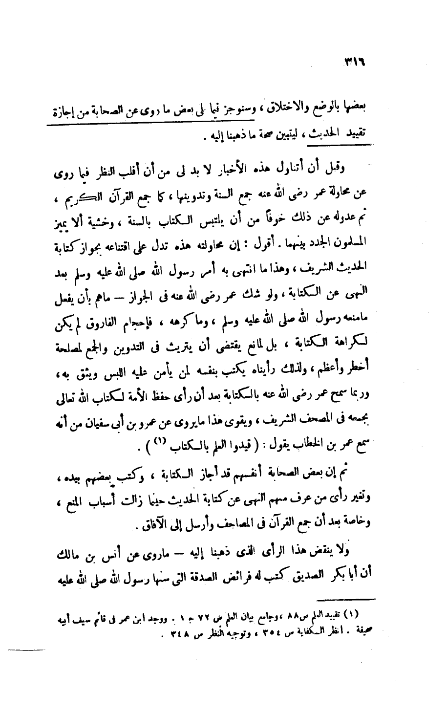وقبل أن أتناول هذه الأخبار لاَ بُدَّ لي من أن أقلب النظر فيما روي عن محاولة عمر - رَضِيَ اللهُ عَنْهُ - جمع السنة وتدوينها، كما جمع القرآن الكريم، ثم عدوله عن ذلك خَوْفًا من أن يلتبس الكتاب بالسنة، وخشية ألا يميز المسلمون الجدد بينهما. أقول: إن محاولته هذه تدل على اقتناعه بجواز كتابة الحديث الشريف، وهذا ما انتهى به أمر رسول الله - صَلََّى اللهُ عَلَيْهِ وَسَلَّمَ - بعد النهي عن الكتابة، ولو شك عمر - رَضِيَ اللهُ عَنْهُ - في الجواز - مَا هَمَّ بأن يفعل ما منعه رسول الله - صَلََّى اللهُ عَلَيْهِ وَسَلَّمَ -، وما كرهه، فإحجام الفاروق لم يكن لكراهة الكتابة، بل لمانع يقتضي أن يتريث في التدوين والجمع لمصلحة أخطر وأعظم، ولذلك رأيناه يكتب بنفسه لمن يأمن عليه اللبس ويثق به، وربما سمح عمر - رَضِيَ اللهُ عَنْهُ - بالكتابة بعد أن رأى حفظ الأمة لكتاب الله تعالى بجمعه في المصحف الشريف، ويقوي هذا ما يروى عن عمرو بن أبي سفيان من أنه سمع عمر بن الخطاب يقول: «قيِّدُوا العِلْمَ بِالكِتَابِ» (¬1).