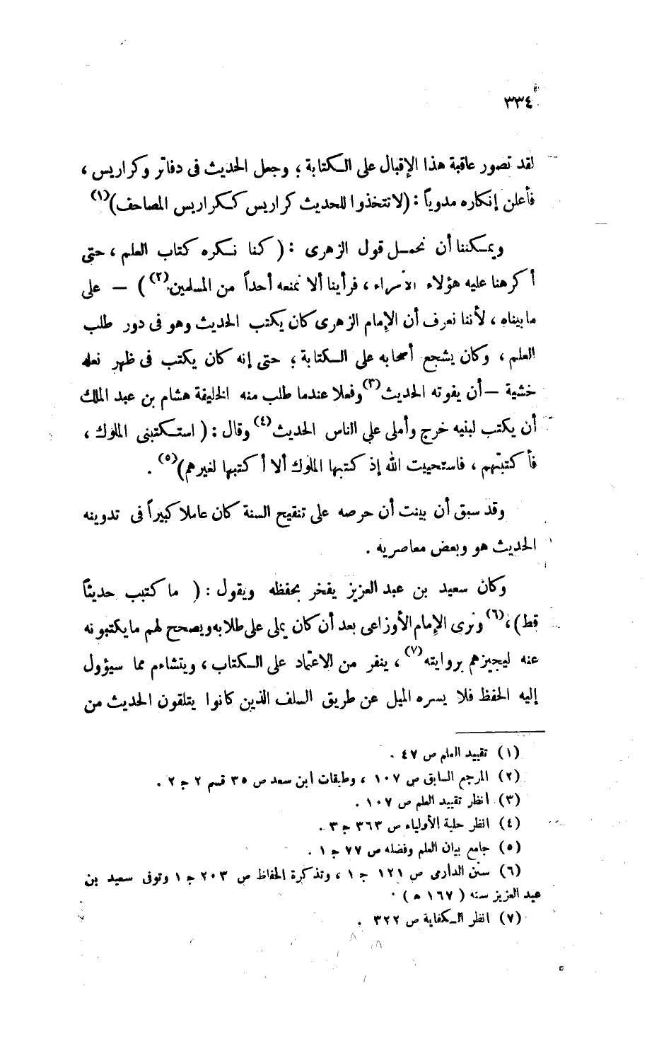 وكان سعيد بن عبد العزيز يفخر بحفظه ويقول: «مَا كَتَبْتُ حَدِيثًا قَطُّ» (¬6). ونرى الإمام الأوزاعي بعد أن كان يملي على طلابه ويصحح لهم ما يكتبونه عنه ليجيزهم بروايته (¬7)، ينفر من الاعتماد على الكتاب، ويتشاءم مما سيؤول إليه الحفظ فلا يسره الميل عن طريق السلف الذين كانوا يتلقون الحديث من