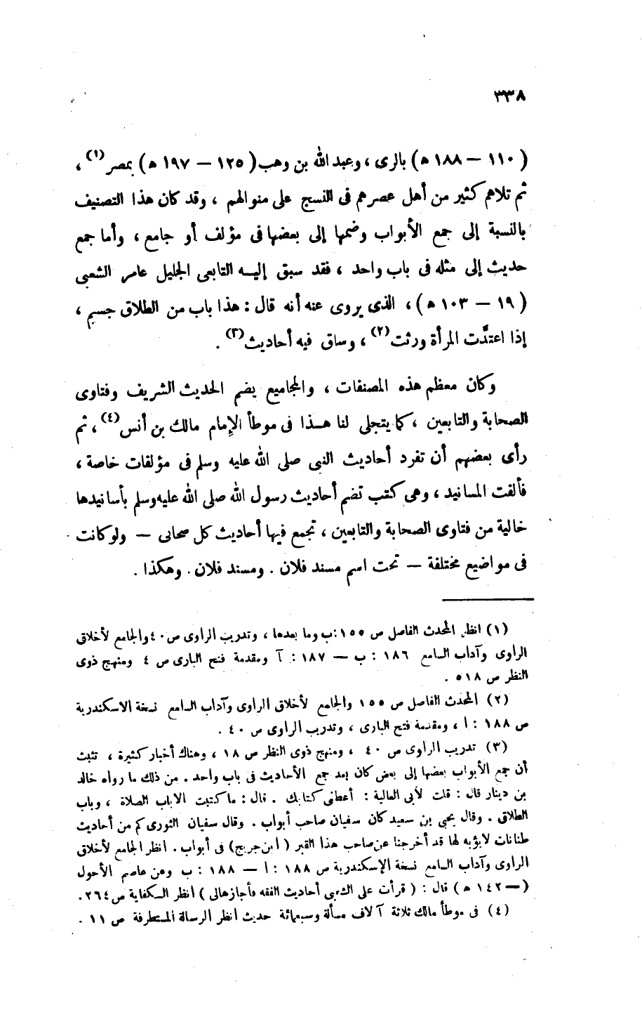(¬3) " تدريب الراوي ": ص 40، و" منهج ذوي النظر ": ص 18، وهناك أخبار كثيرة، تثبت أن جمع الأبواب بعضها إلى بعض كان بعد جمع الأحاديث في باب واحد. من ذلك ما رواه خَالِدُ بْنُ دِينَارٍ، قَالَ: «قُلْتُ لأَبِي العَالِيَةِ: أَعْطِنِي كِتَابَكَ»، قَالَ: «مَا كَتَبْتُ إِلاَّ بَابَ الصَّلاَةِ، وَبَابَ الطَّلاَقِ». وقال يحيى بن سعيد: «كَانَ سُفْيَانُ صَاحِبَ أَبْوَابٍ». وقال سفيان الثوري: «كَمْ مِنْ أَحَادِيثَ طَنَّانَاتٍ لاَ يُؤْبَهُ لَهَا قَدْ أَخْرَجْنَا عَنْ صَاحِبِ هَذَا القَبْرِ (ابْنُ جُرَيْجٍ) فِي أَبْوَابٍ». انظر " الجامع لأخلاق الراوي وآداب السامع " نسخة الإسكندرية: ص 188: آ - 188: ب وعن عاصم الأحول (- 142 هـ) قال: «قَرَأْتُ عَلَى الشَّعْبِيِّ أَحَادِيثَ فِي الفِقْهِ فَأَجَازَهَا لِي». انظر " الكفاية ": ص 264.