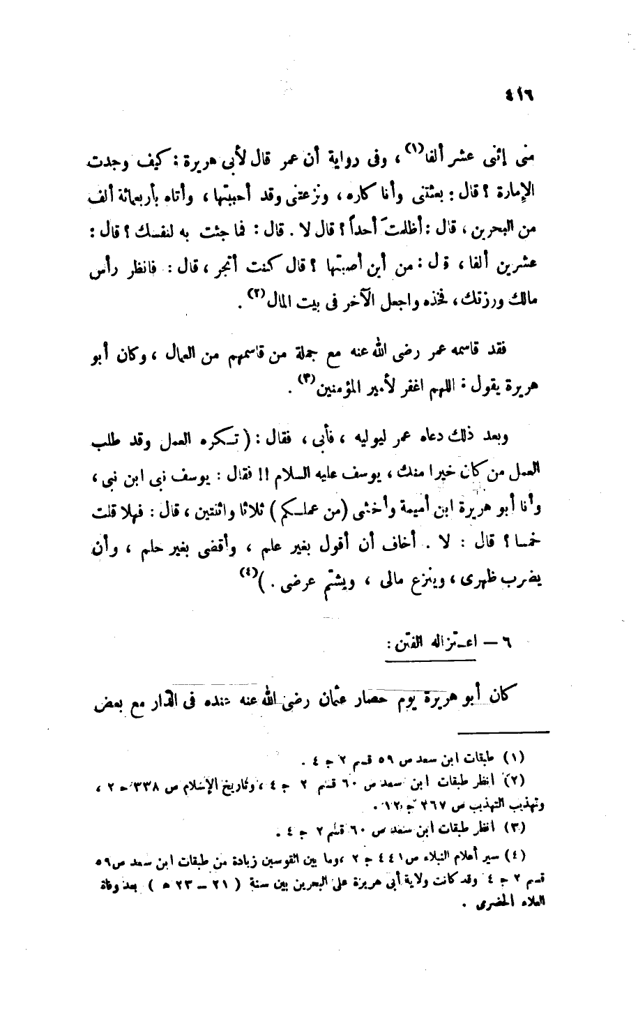 (¬4) " سير أعلام النبلاء ": ص 441 جـ 2، وما بين قوسين زيادة من " طبقات ابن سعد ": ص 59 قسم 2 جـ 4 وقد كانت ولاية أبي هريرة بين سَنَةِ (21 - 23 هـ). بعد وفاة العلاء الحضرمي.