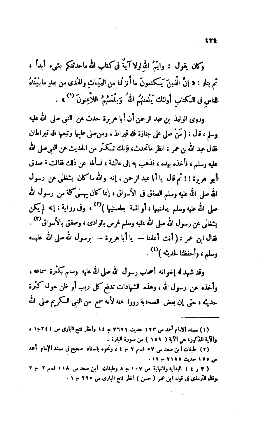 (¬1) " مسند الإمام أحمد: ص 123، حديث 7691 جـ 14، وانظر " فتح الباري ": ص 244 جـ 1، والآية (159) من سورة البقرة.