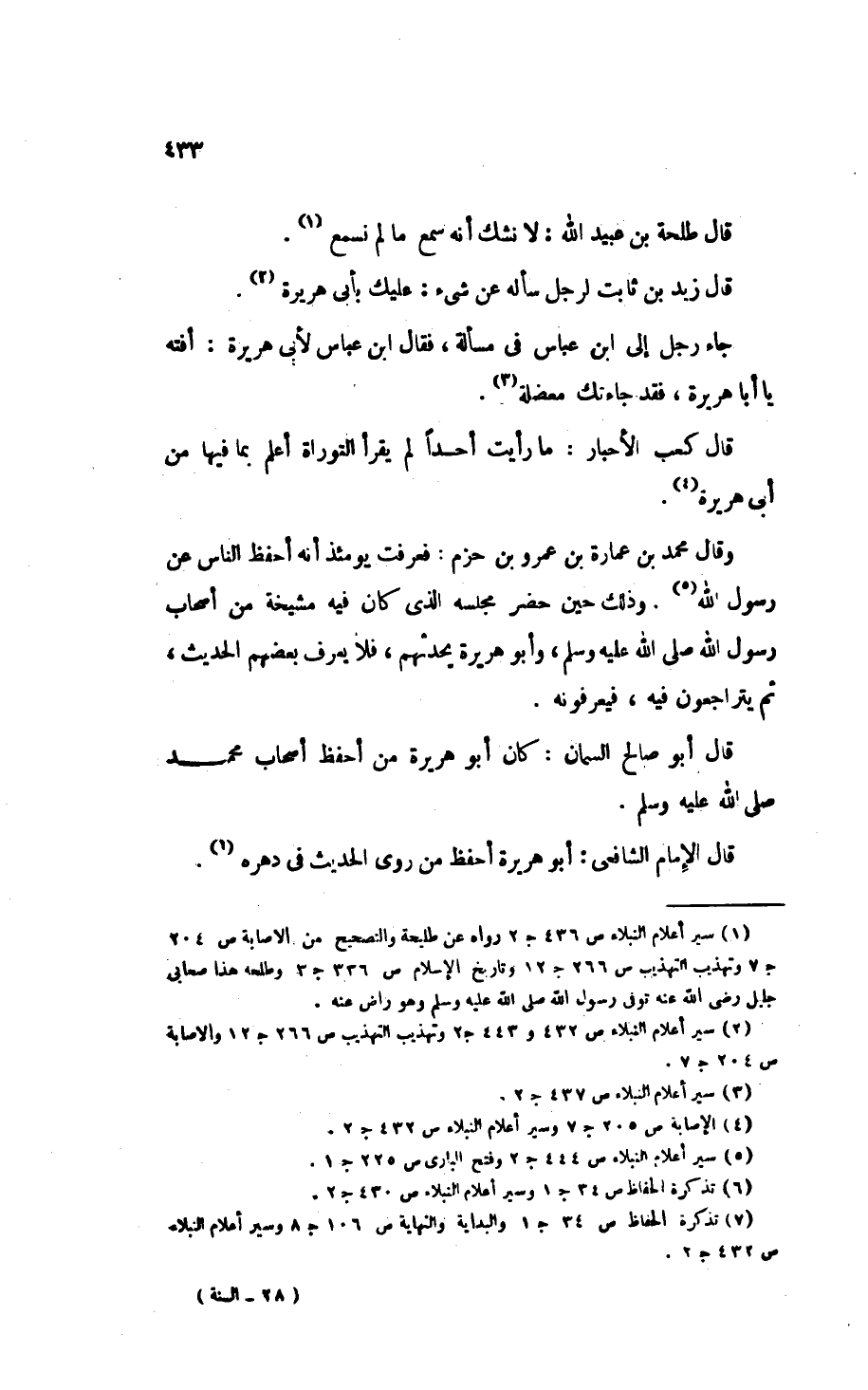 (¬1) " سير أعلام النبلاء ": ص 436 جـ 2، رواه عن طلحة والتصحيح من " الإصابة ": ص 204 جـ 7، و" تهذيب التهذيب ": ص 266 جـ 12، و" تاريخ الإسلام ": ص 336 جـ 3. وطلحة هذا صحابي جليل - رَضِيَ اللهُ عَنْهُ - توفي رسول الله - صَلَّى اللهُ عَلَيْهِ وَسَلَّمَ - وهو راض عنه.