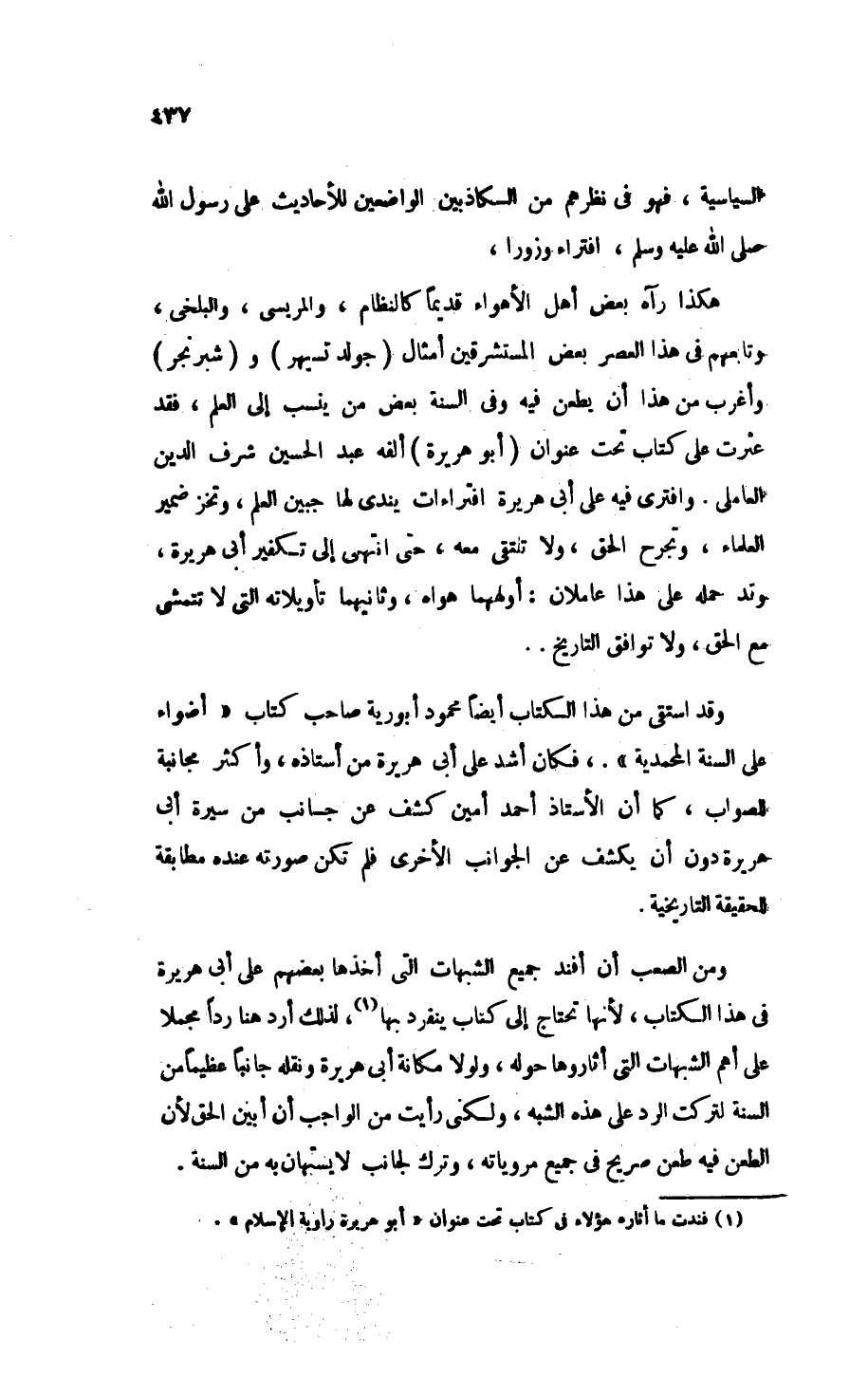 هكذا رآه بعض أهل الأهواء قديمًا كالنظَّام، والمريسي، وَالبَلْخِي، وتابعهم في هذا العصر بعض المستشرقين أمثال (جولدتسيهر) و (شبرنجر) وأغرب من هذا أنْ يطعن فيه وفي السُنَّةِ بعض من يُنسبُ إلى العلم، فقد عثرتُ على كتاب تحت عنوان " أبو هريرة " ألَّفه عبد الحُسين شرف الدين العاملي، وافترى فيه على أبي هريرة افتراءات يَنْدَى لَهَا جبين العلم، وَتَخِزُ ضمير العلماء، وتجرح الحق، ولا تلتقي معه، حتى انتهى إلى تكفير أبي هريرة، وقد حمله على هذا عاملان: أولهما هواه، وثانيهما تأويلاته التي لا تتمشى مع البحث العلمي، ولا توافق التاريخ ..