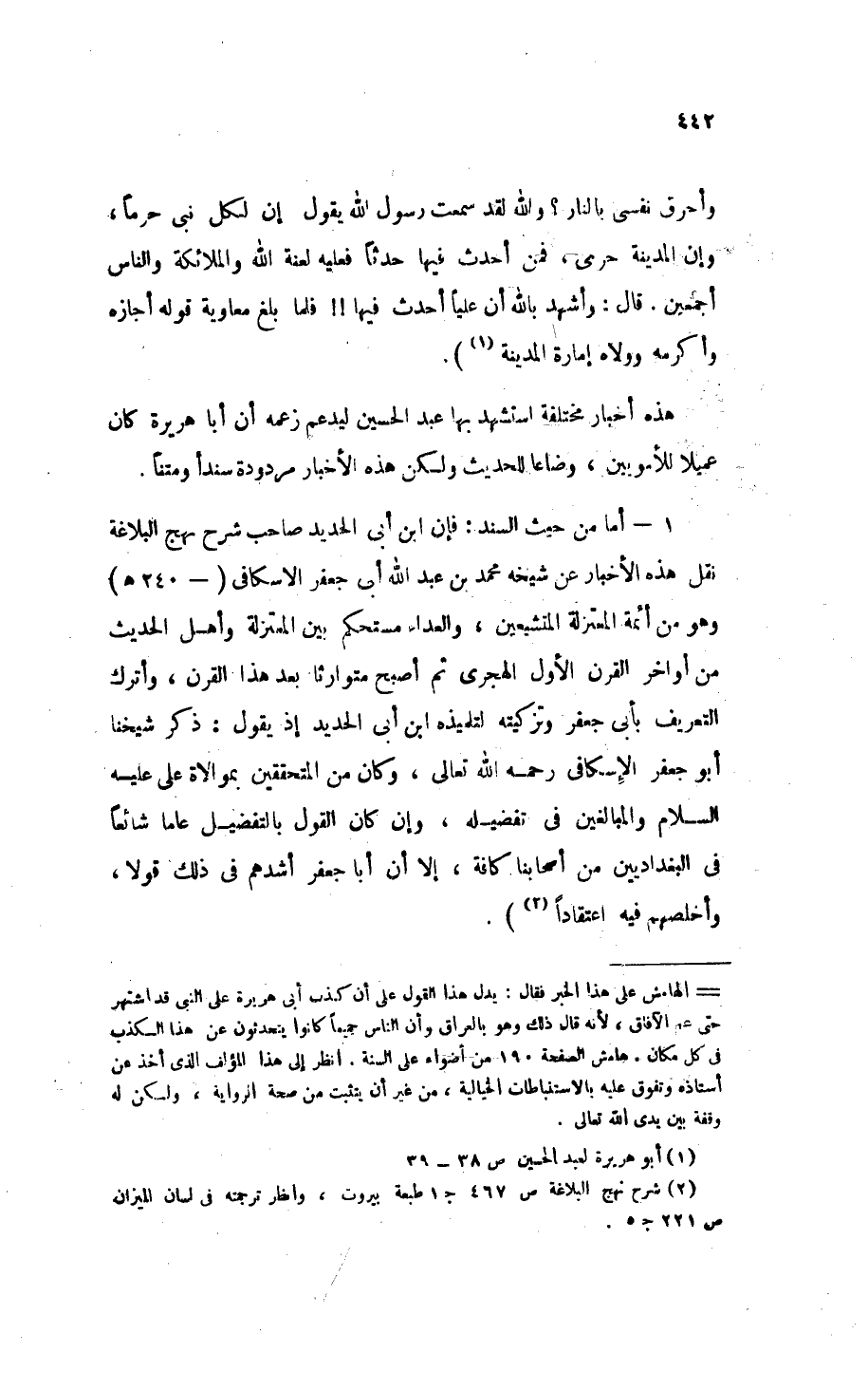 1 - أما من حيث السند. فإنَّ ابن أبي الحديد صاحب " شرح نهج البلاغة " نقل هذه الأخبار عن شيخه محمد بن عبد الله أبي جعفر الإسكافي (- 240 هـ) وهو من أئمة المعتزلة المُتَشَيِّعِينَ، والعداء مستحكم بين المعتزلة وأهل الحديث من أواخر القرن الأول الهجري وأصبح مُتَوَارَثًا بعد هذا القرن. وأترك التعريف بأبي جعفر وتزكيته لتلميذه ابن أبي الحديد فيقول: «ذكر شيخنا أبو جعفر الإسكافي - رَحِمَهُ اللهُ تَعَالَى - وكان من المُتَحَقِّّقِينَ بموالاة عَلِيٍّ - عَلَيْهِ السَّلاَمُ - والمُبالغين في تفضيله وإنْ كان القول بالتفضيل عَامًّا شَائِعًا في البغداديِّين من أصحابنا كافة، إلاَّ أنَّ أبا جعفر أَشَدُّهُمْ في ذلك قولاً، وأخلصهم فيه اعتقادًا (¬2)».