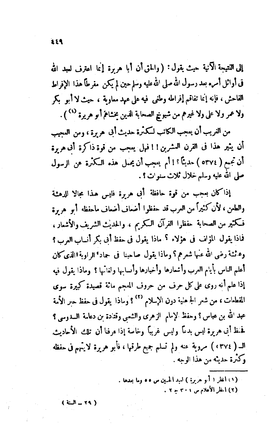 من الغريب أنْ يعجب الكاتب لكثرة حديث أبي هريرة، ومن العجيب أَنْ يثير هذا في القرن العشرين!! فهل يعجب من قوة ذاكرة أبي هريرة أنْ تجمع (5374) حَدِيثًا؟ أم يعجب أنْ يحمل هذه الكثرة عن الرسول - صَلََّى اللهُ عَلَيْهِ وَسَلَّمَ - خلال ثلاث سنوات؟.