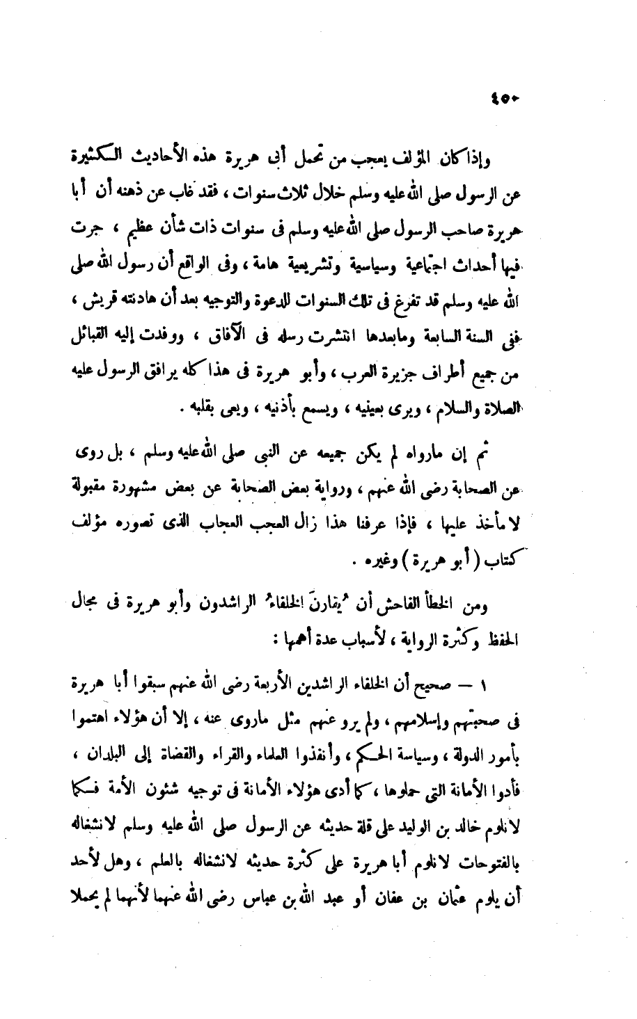 1 - صحيح أنَّ الخلفاء الأربعة - رَضِيَ اللهُ عَنْهُمْ - سبقوا أبا هريرة في صُحْبَتِهِمْ وإسلامهم، وَلَمْ يُرْوَ عنهم مثل ما رُوِيَ عنه. إلاَّ أنَّ هؤلاء اهْتَمُّوا بأمور الدولة وسياسة الحكم، وأنفذوا العلماء وَالقُرَّاءَ والقضاة إلى البلدان، فَأَدُّوا الأمانة التي حملوها، كما أدى هؤلاء الأمانة في توجيه شؤون الأُمَّةِ. فكما لا نلوم خالد بن الوليد على قِلَّةِ حديثه عن الرسول - صَلََّى اللهُ عَلَيْهِ وَسَلَّمَ - لانشغاله بالفتوحات لا نلوم أبا هريرة على كثرة حديثه لانشغاله بالعلم، وهل لأحد أنْ يلوم عثمان - رَضِيَ اللهُ عَنْهُ - أو عبد الله بن عباس لأنهما لم يحملا