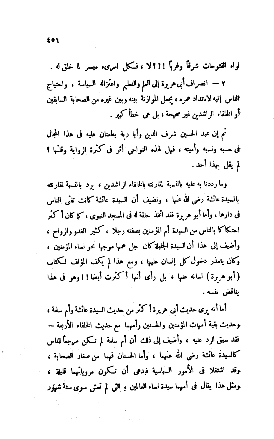 أما أنه يرى حديث أبي هريرة أكثر من حديث السيدة عائشة وأم سلمة وحديث بقية أمهات المؤمنين وَالحَسَنَيْن وَأمَّهُمَا مع حديث الخلفاء الأربعة، فقد سبق الرد عليه، وأضيف أَنَّ أم سلمة لم تكن مَرْجِعًا للناس كالسيدة عائشة - رَضِيَ اللهُ عَنْهُمَا -، وأما الحَسَنَانِ فهما من صغار الصحابة، وقد اشتغلا في الأمور السياسية، فَبَدَهِيٌّ أنْ تكون مروياتهما قليلة، ومثل هذا يقال في أُمِّهِمَا سَيِّدَةُ نِسَاءِ العَالَمِينَ، التي لم تعش سوىستة شهور