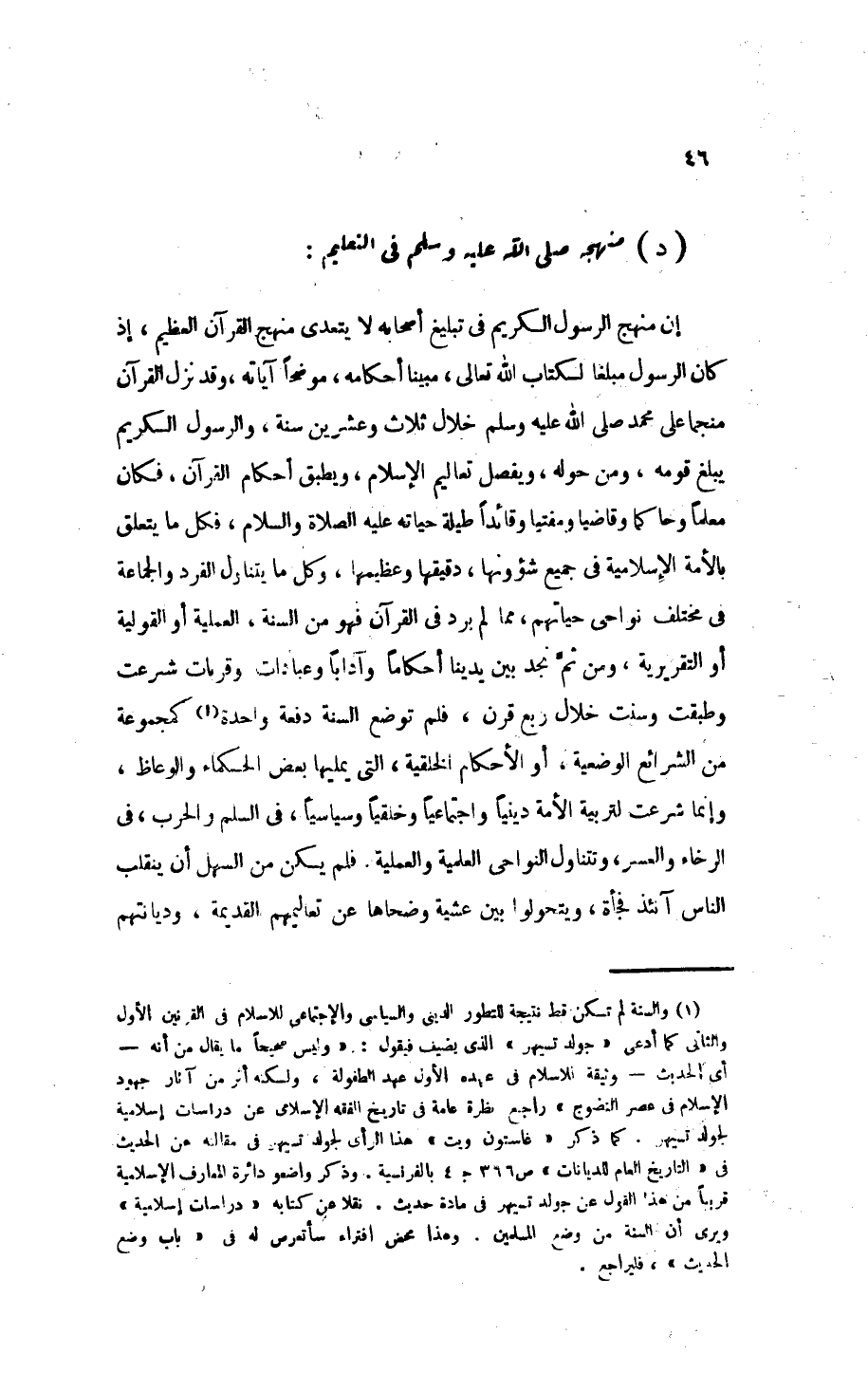 إنَّ منهج الرسول الكريم في تبليغ أصحابه لاَ يَتَعَدَّى منهج القرآن العظيم، إذْ كان الرسول مُبَلِّغًا لكتاب الله تعالى، مُبَيِّنًا أحكامه، مُوَضِّحًا آياته، وقد نزل القرآن الكريم مُنَجَّمًا عَلَى مُحَمَّدٍ - صَلََّى اللهُ عَلَيْهِ وَسَلَّمَ - خلال ثلاث وعشرين سَنَةٍ، والرسول الكريم يبلغ قومه، ومن حوله، ويفصل تعاليم الإسلام، ويطبق أحكام القرآن، فكان معلمًا وحاكمًا وقاضيًا ومفتيًا وقائدًا طيلة حياته - عَلَيْهِ الصَلاَةُ وَالسَّلاَمُ -، فكل ما يتعلق بِالأُمَّةِ الإِسْلاَمِيَّةِ في جميع شؤونها، دقيقها وعظيمها، وكل ما يتناول الفرد والجماعة في مختلف نوحي حياتهم، مما لم يرد في القرآن فهو من السُنَّةِ، العملية أو القولية أو التقريرية، ومن ثَمَّ نجد بين يدينا أحكامًا وآدابًا وعبادات وقربات شُرِّعَتْ وَطُبِّقَتْ وَسُنَّتْ خلال ربع قرن، فلم توضع السُنَّةُ دفعة واحدة (¬1) كمجموعة من الشرائع الوضعية، أو الأحكام الخلقية، التي يمليها بعض الحكماء والوعاظ، وإنما شُرِّعَتْ لتربية الأُمَّة دينيًا واجتماعيًا وخلقيًا وسياسيًا، في السلم والحرب، في الرخاء والعسر، وتتناول النواحي العلمية والعملية، فلم يكن من السهل أن ينقلب الناس آنَئِذٍ فجأة، ويتحوَّلوا بين عشية وضحاها عن تعاليمهم القديمة، وديانتهم
