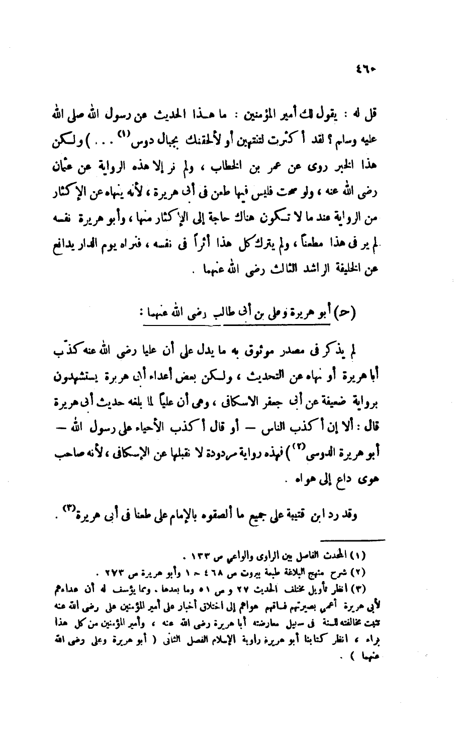 (¬3) انظر " تأويل مختلف الحديث ": ص 27 و 51 وما بعدها، ومما يؤسف له أن عداءهم لأبي هريرة أعمى بصيرتهم فساقهم هواهم إلى اختلاق أخبار على أمير المؤمنين عَلِيٍّ - رَضِيَ اللهُ عَنْهُ -، وأمير المؤمنين من كل هذا براء، انظر كتابنا " أبو هريرة راوية الإسلام ": الفصل الثاني (أبو هريرة وعَلِيٍّ - رَضِيَ اللهُ عَنْهُمَا -).