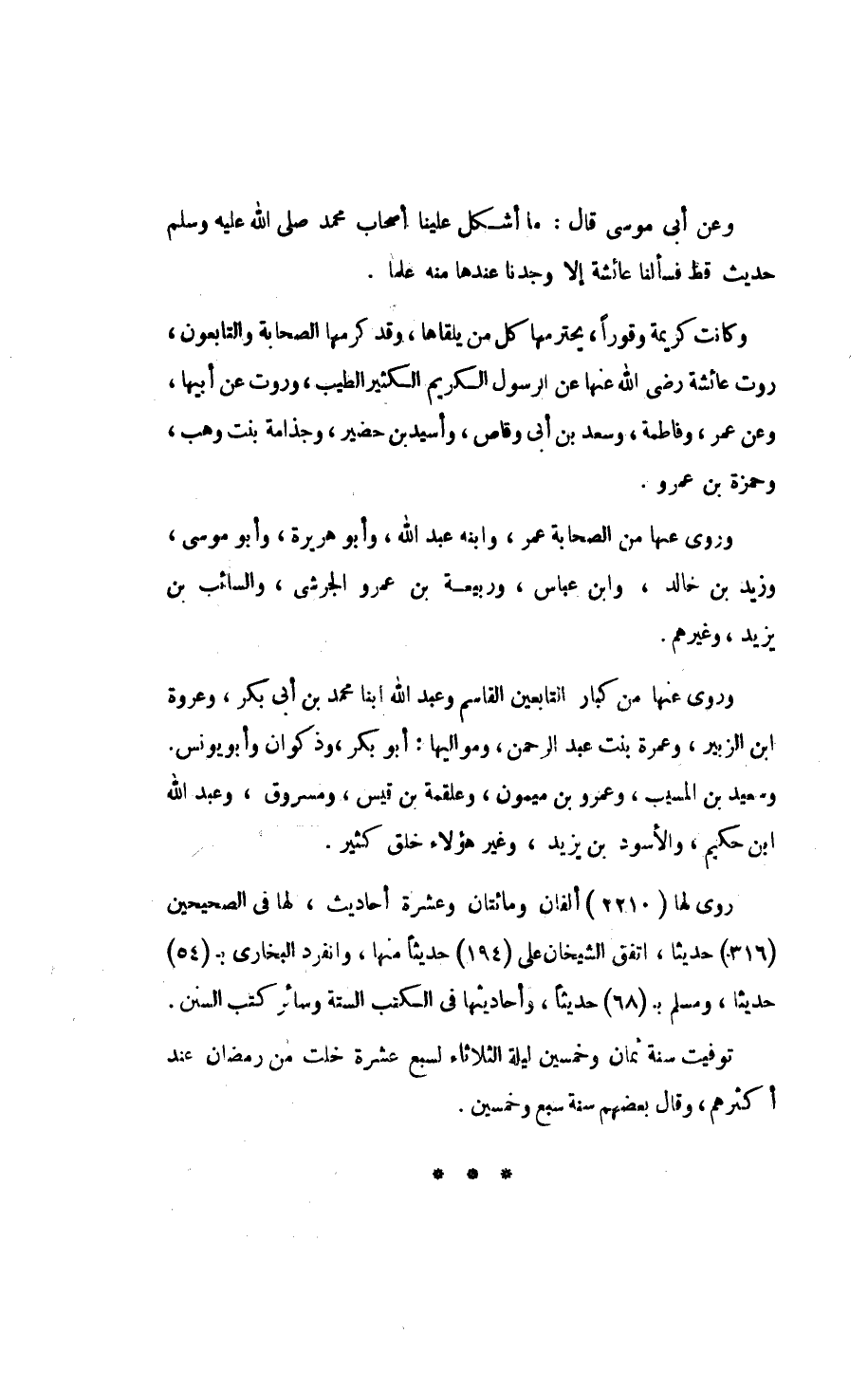رُوِيَ لها [2210] ألفان ومائتان وعشرة أحاديث، لها في " الصحيحين " [316] حَدِيثًا، اتفق الشيخان على [194] حَدِيثًا منها، وانفرد البخاري بـ[54] حَدِيثًا، ومسلم بـ[68] حَدِيثًا، وأحاديثها في " الكتب الستة " وسائر كتب السنن.