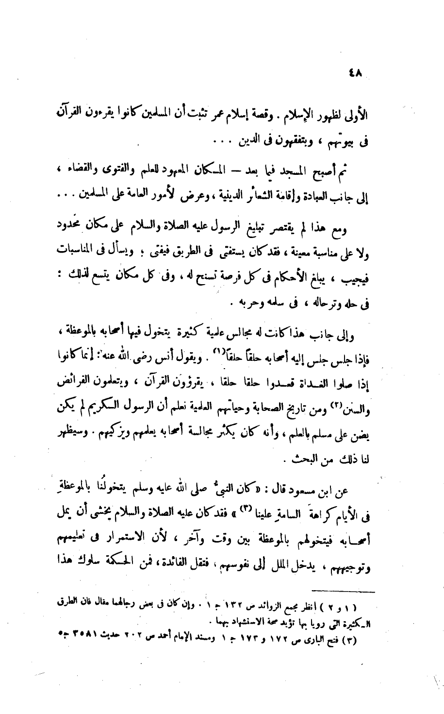 وإلى جانب هذا كانت له مجالس علمية كثيرة يتخول فيها أصحابه بالموعظة، فإذا جلس جلس إليه أصحابه حِلَقًا حِلَقًا (¬1). ويقول أنس - رَضِيَ اللهُ عَنْهُ -: «إِنَّمَا كَانُوا إِذَا صَلُّوا الغَدَاةَ قَعَدُوا حلقاً حلقاً، يَقْرَؤُونَ القُرْآنَ، وَيَتَعَلَّمُونَ الفَرَائِضَ وَالسُّنَنَ» (¬2) ومن تاريخ الصحابة وحياتهم العلمية تعلم أَنَّ الرسول الكريم لم يكن يضن على مسلم بالعلم، وأنه كان يكثر مجالسة أصحابه يعلمهم وَيُزَكِّيهِمْ. وسيظهر لنا ذلك من البحث.
