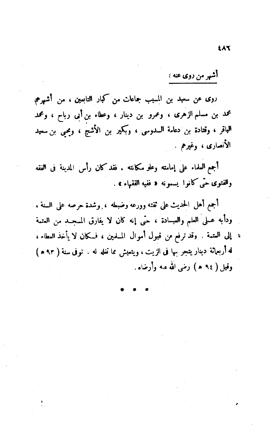 أجمع أهل الحديث على ثقته وورعه وضبطه، وشدة حرصه على السُنَّةِ، ودأبه على العلم والعبادة، حتى إنه كان لا يفارق المسجد من العتمة إلى العتمة. وقد ترفع عن قبول أموال المسلمين، فكان لا يأخذ العطاء، له أربعمائة دينار يَتَّجِرُ بها في الزيت، ويتعيش مما تغله له. توفي سَنَةَ (92 هـ)، وقيل (94 هـ) - رَضِيَ اللهُ عَنْهُ وَأَرْضَاهُ -.