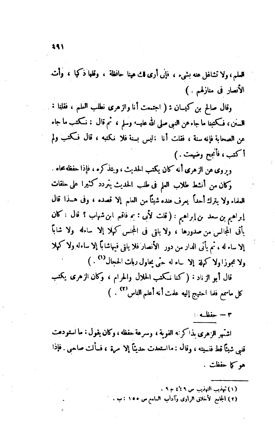 ويروى عن الزهري أنه كان يكتب الحديث، ويتذكره، فإذا حفظه محاه. وكان من أنشط طلاب العلم في طلب الحديث يتردد كثيرًا على حلقات العلماء ولا يترك أحدًا يعرف عنده شيئًا من العلم إلا قصده، وفي هذا قال إِبْرَاهِيمُ بْنِ سَعْدٍ بْنُ إِبْرَاهِيمَ قَالَ: «قُلْتُ لأَبِي: " بِمَ [فَاقَكُمُ] الزُّهْرِيُّ؟ " قَالَ: " كَانَ يَأْتِي المَجَالِسَ مِنْ صُدُورِهَا، وَلاَ يَلْقَى فِي المَجْلِسِ كَهْلاً إِلاَّ سَاءَلَهُ وَلاَ شَابًّا إِلاَّ سَاءَلَهُ، ثُمَّ يَأْتِي الدَّارَ مِنْ دُورِ الأَنْصَارِ، فَلاَ يَلْقَى فِيهَا شَابًّا إِلاَّ سَاءَلَهُ، وَلاَ كَهْلاً وَلاَ عَجُوزًا وَلاَ كَهَلَةً إِلاَّ سَاءَلَهُ حَتَّى يُحَاوِلُ رَبَّاتِ الْحِجَالِ "» (¬1).