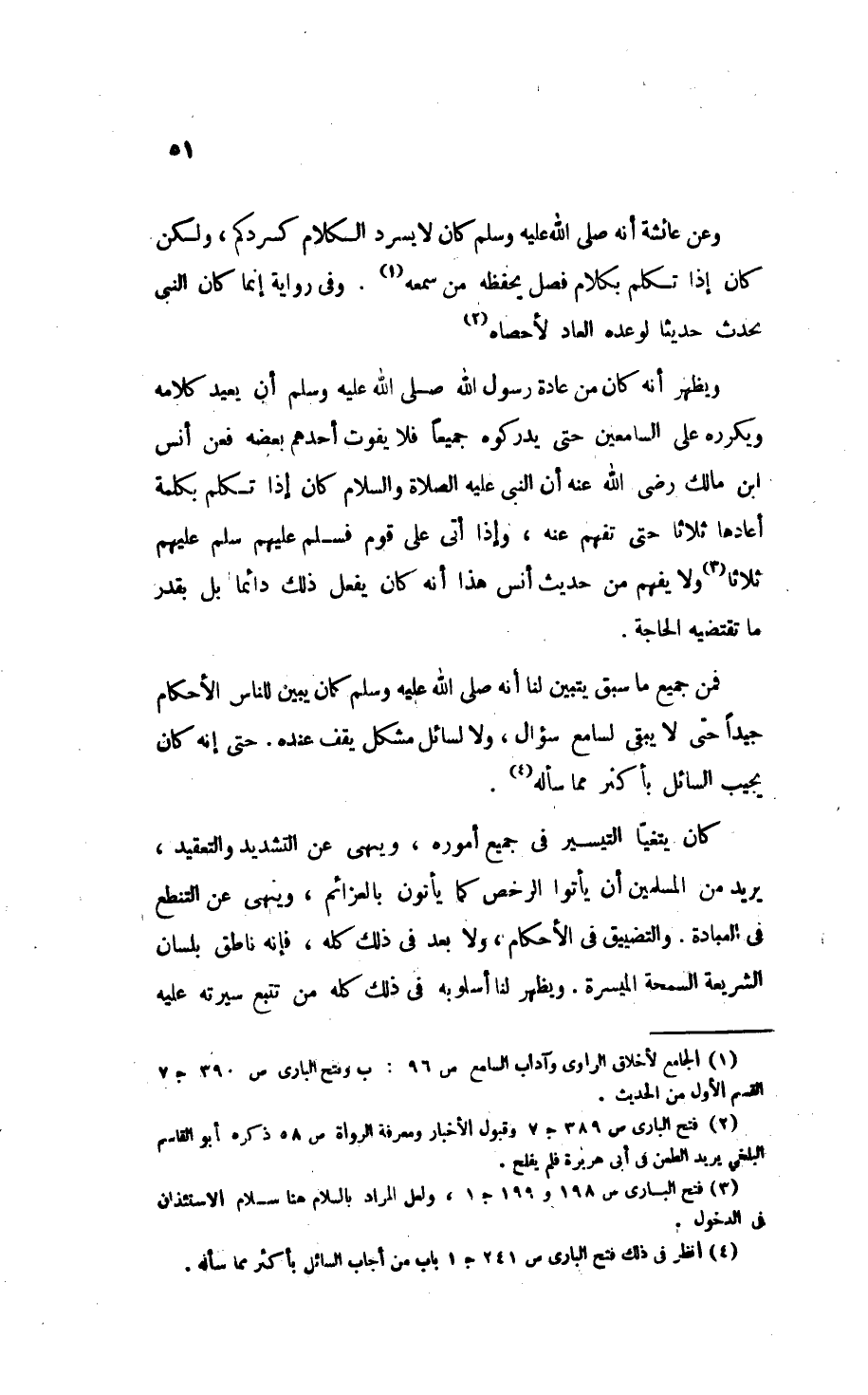 ويظهر أنه كان من عادة رسول الله - صَلََّى اللهُ عَلَيْهِ وَسَلَّمَ - أنْ يعيد كلامه ويكرره على السامعين حتى يدركوه جَمِيعًا فلا يفوت أحدهم بعضه فَعَنْ أَنَسٍ بْنِ مَالِكٍ - رَضِيَ اللهُ عَنْهُ - أَنَّ النَّبِيَّ - عَلَيْهِ الصَلاَةُ وَالسَّلاَمُ - «كَانَ إِذَا تَكَلَّمَ بِكَلِمَةٍ أَعَادَهَا ثَلاَثًا، حَتَّى تُفْهَمَ عَنْهُ، وَإِذَا أَتَى عَلَى قَوْمٍ فَسَلَّمَ عَلَيْهِمْ، سَلَّمَ عَلَيْهِمْ ثَلاَثًا (¬3)». ولا يفهم من حديث أنس هذا أنه كان يفعل ذلك دائمًا بل بقدر ما تقتضيه الحاجة.