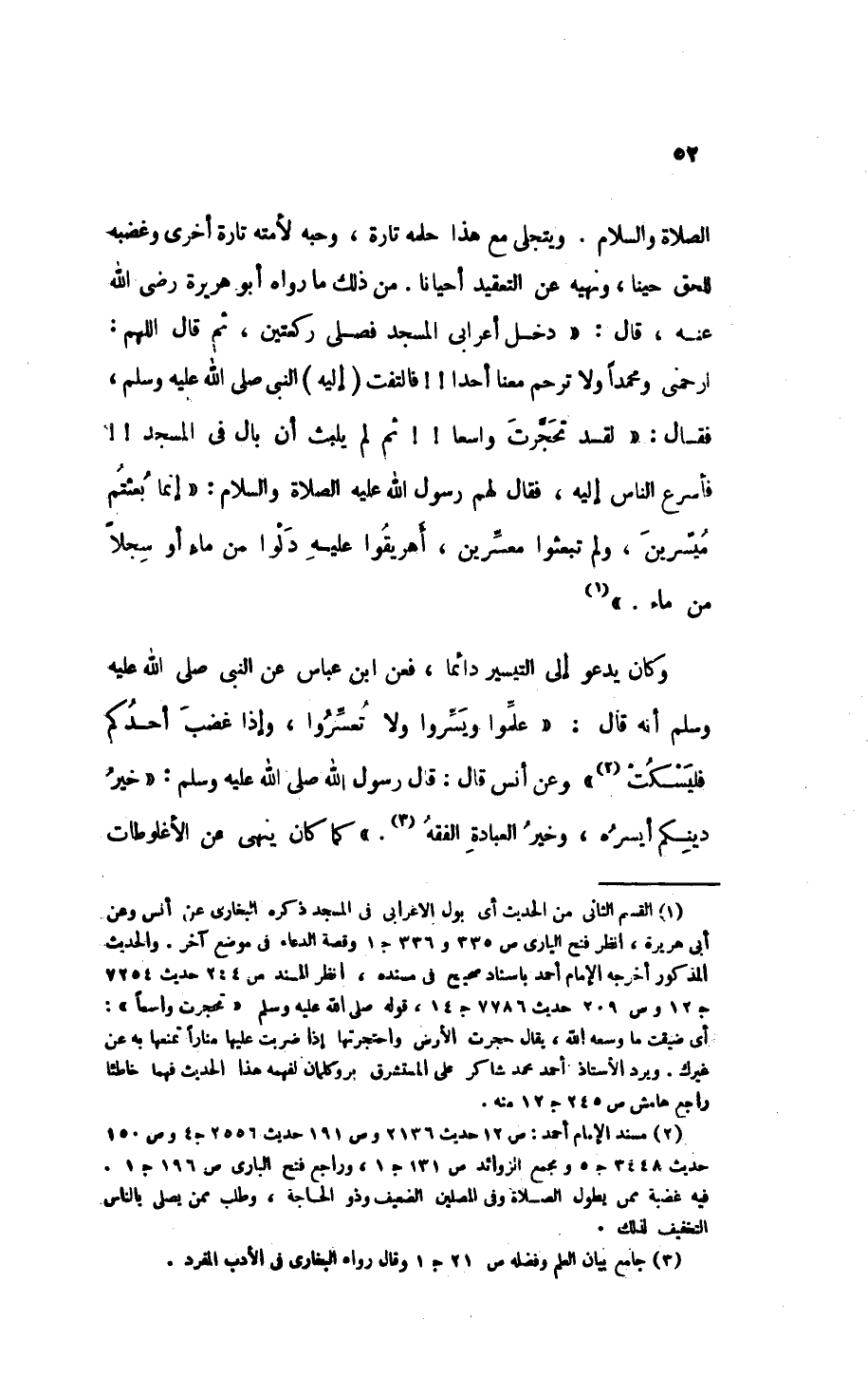 (¬1) القسم الثاني من الحديث أي بول الأعرابي في المسجد ذكره البخاري عن أنس وعن أبي هريرة، انظر " فتح الباري ": ص 335 و 336 جـ 1 وقصة الدعاء في موضع آخر. والحديث المذكور أخرجه الإمام أحمد بإسناد صحيح في " مسنده "، انظر " المسند ": ص 244 حديث 7254 جـ 12 وص 209 حديث 7786 جـ 14، قوله - صَلََّى اللهُ عَلَيْهِ وَسَلَّمَ -: «تَحَجَّرْتَ وَاسِعًا»: أي ضيَّقْتَ ما وسعه الله، يقال: حجرت الأرض واحتجرتها إذا ضربت عليها مَنَارًا تمنعها به عن غيرك. ويرد الأستاذ أحمد شاكر على المستشرق بروكلمان لفهمه هذا الحديث فَهْمًا خَاطِئًا. راجع هامش ص 245 جـ 12 منه.