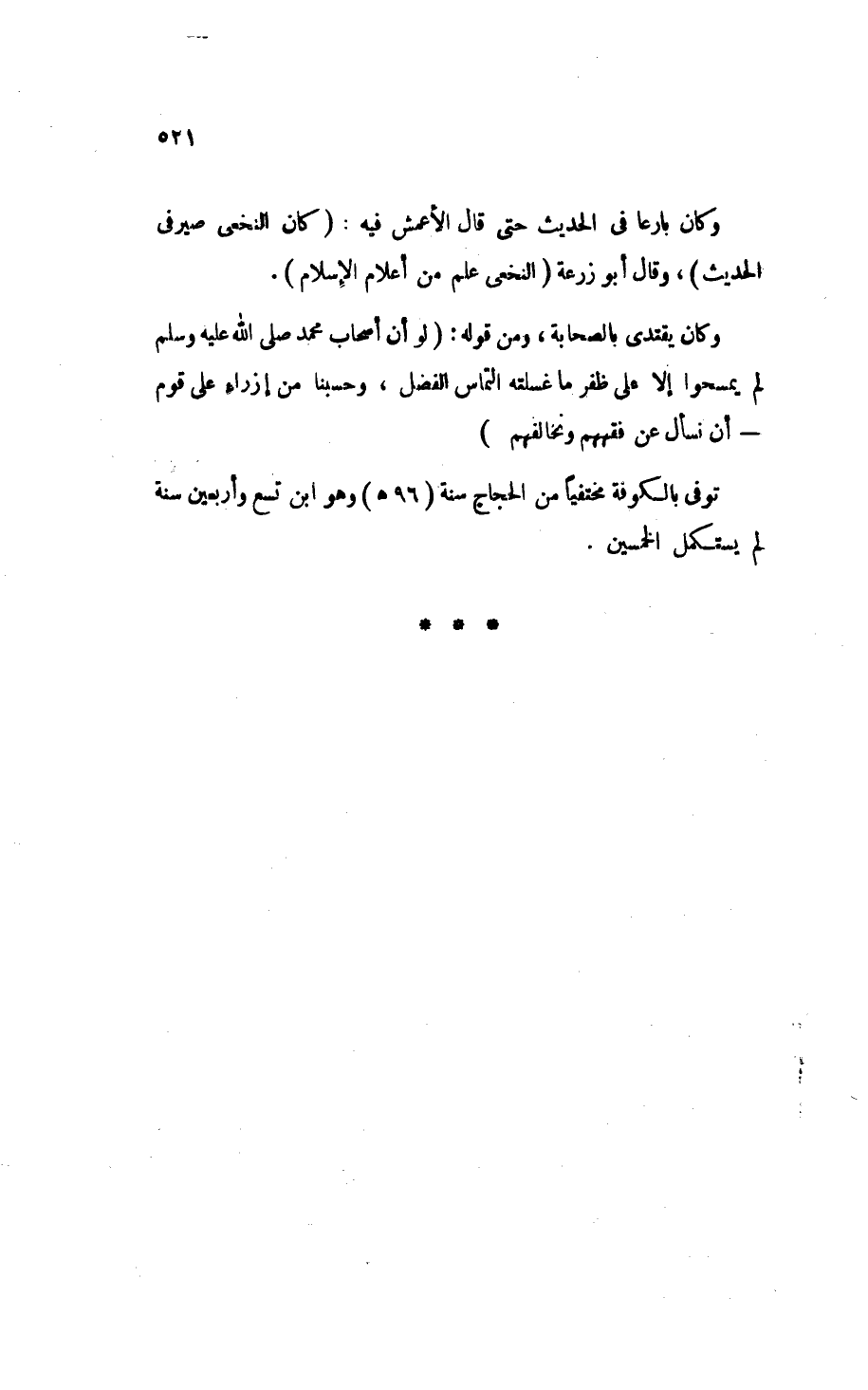 وكان يقتدي بالصحابة، ومن قوله: «لَوْ أَنَّ أَصْحَابَ مُحَمَّدٍ - صَلََّى اللهُ عَلَيْهِ وَسَلَّمَ - لَمْ يَمْسَحُوا إِلاَّ عَلَى ظُفُرٍ مَا غَسَلْتُهُ التِمَاسَ الفَضْلِ , وَحَسْبُنَا مِنْ إِزْرَاءٍ عَلَى قَوْمٍ أَنْ نَسْأَلَ عَنْ فِقْهِهِمْ وَنُخَالِفَ أَمْرَهُمْ».