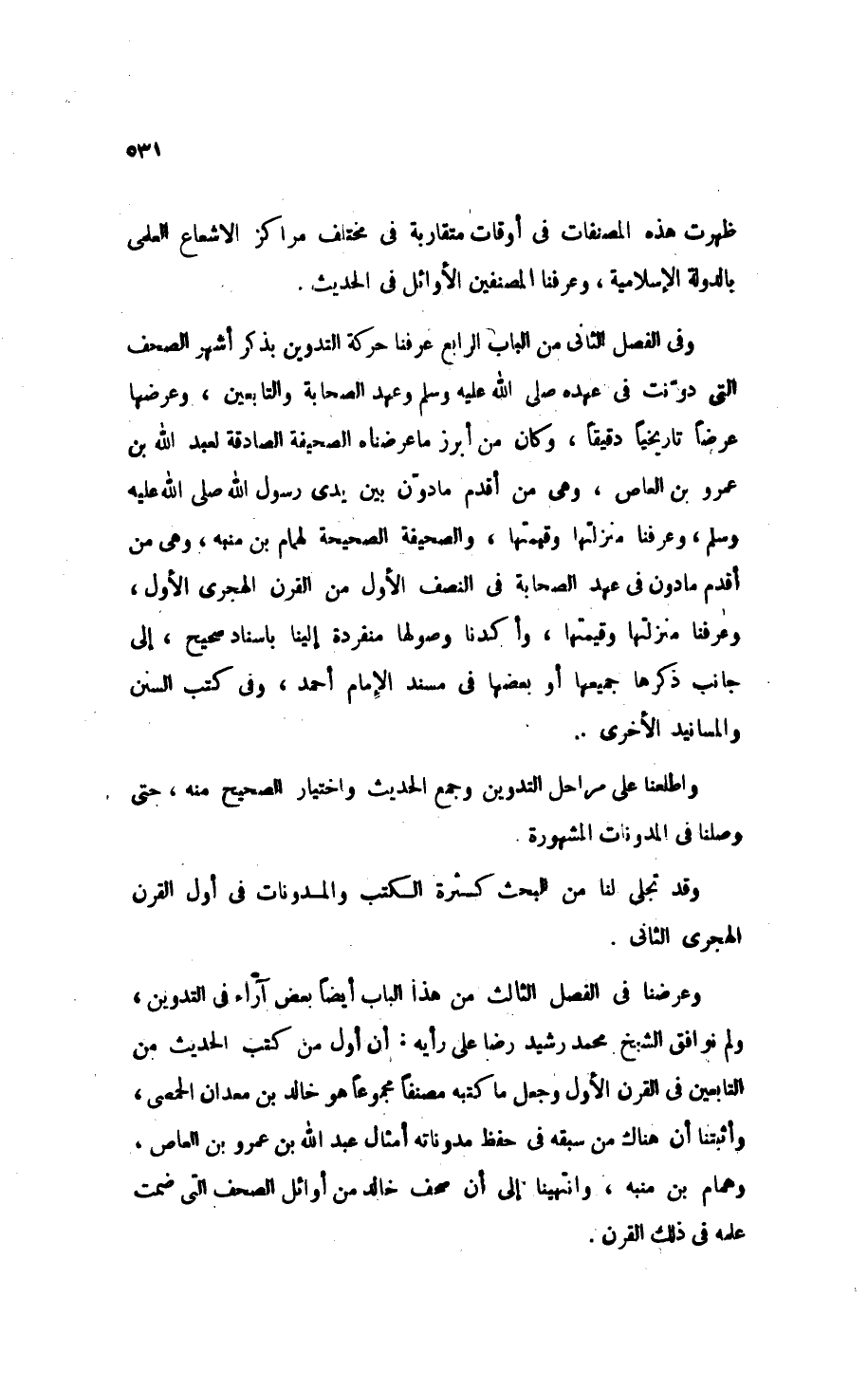 وفي الفصل الثاني من الباب الرابع عرفنا حركة التدوين بذكر أشهر الصحف التي دونت في عهده - صَلََّى اللهُ عَلَيْهِ وَسَلَّمَ - وعهد الصحابة والتابعين، وعرضها عرضًا تاريخيًا دقيقًا، وكان من أبرز ما عرضناه " الصحيفة الصادقة " لعبد الله بن عمرو بن العاص، وهي من أقدم ما دُوِّنَ بين يدي رسول الله - صَلََّى اللهُ عَلَيْهِ وَسَلَّمَ -، وعرفنا منزلتها وقيمتها، و" الصحيفة الصحيحة " لهمام بن منبه، وهي من أقدم ما دُوِّنَ في عهد الصحابة في النصف الأول من القرن الهجري الأول، وعرفنا منزلتها وقيمتها، وأكدنا وصولها منفردة إلينا بإسناد صحيح، إلى جانب ذكرها جميعها أو بعضها في " مسند الإمام أحمد "، وفي كتب السنن والمسانيد الأخرى.
