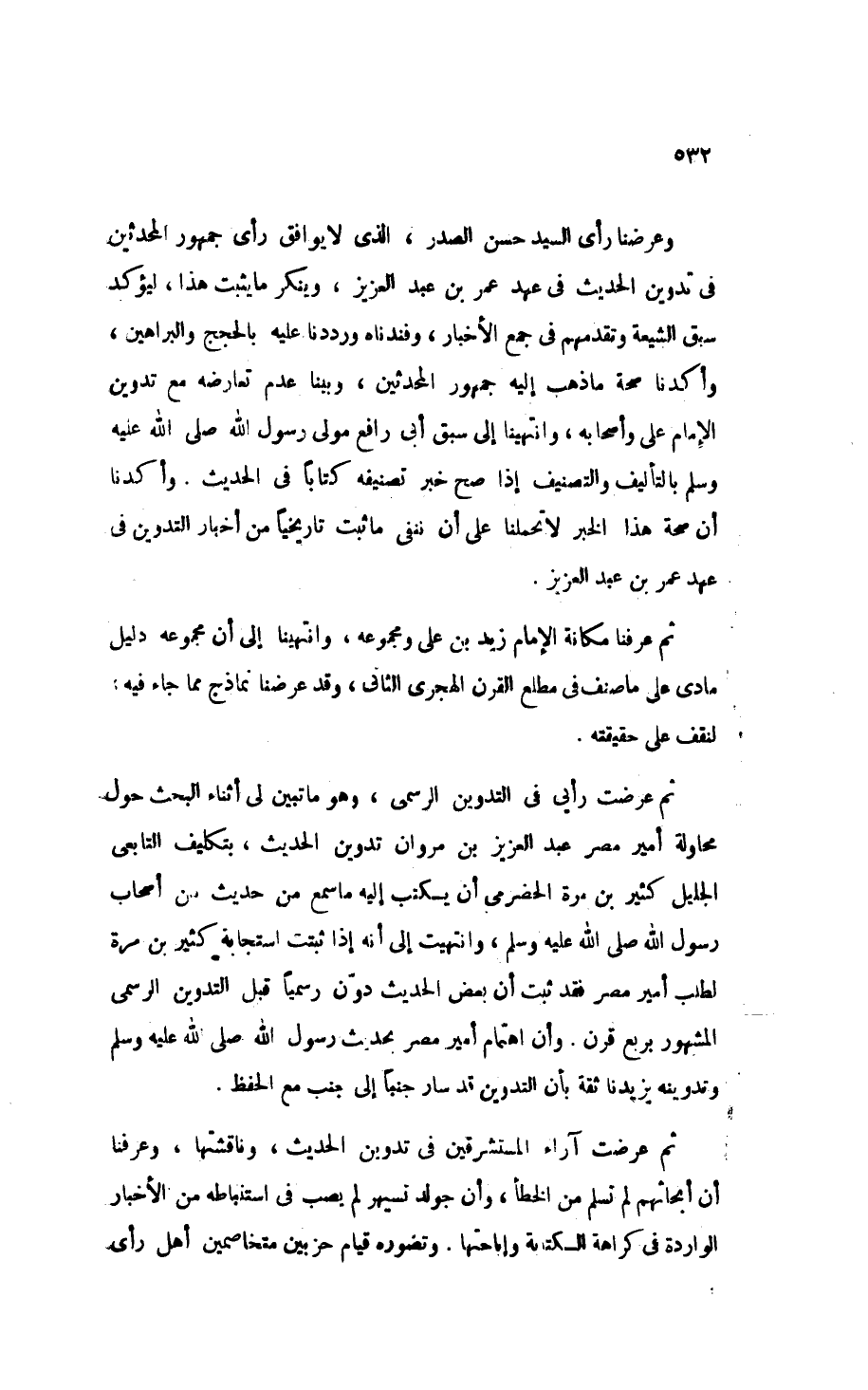 وعرضنا رأي السيد حسن الصدر، الذي لا يوافق رأي جمهور المحدثين في تدوين الحديث في عهد عمر بن عبد العزيز، وينكر ما يثبت هذا، ليؤكد سبق الشيعة وتقدمهم في جمع الأخبار، وفندناه ورددنا عليه بالحجج والبراهين، وأكدنا صحة ما ذهب إليه جمهور المحدثين، وَبَيَّنَّا عدم تعارضه مع تدوين الإمام علي وأصحابه، وانتهينا إلى سبق أبي رافع مولى رسول الله - صَلََّى اللهُ عَلَيْهِ وَسَلَّمَ - بالتأليف والتصنيف إذا صح خبر تصنيفه كتابًا في الحديث. وأكدنا أن صحة هذا الخبر لا تحملنا على أن ننفي ما ثبت تاريخيًا من أخبار التدوين في عهد عمر بن عبد العزيز.