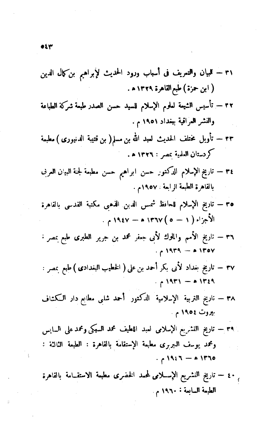 38 - " تاريخ التربية الإسلامية " للدكتور أحمد شلبي، مطابع دار الكشاف، بيروت: 1954 م.
