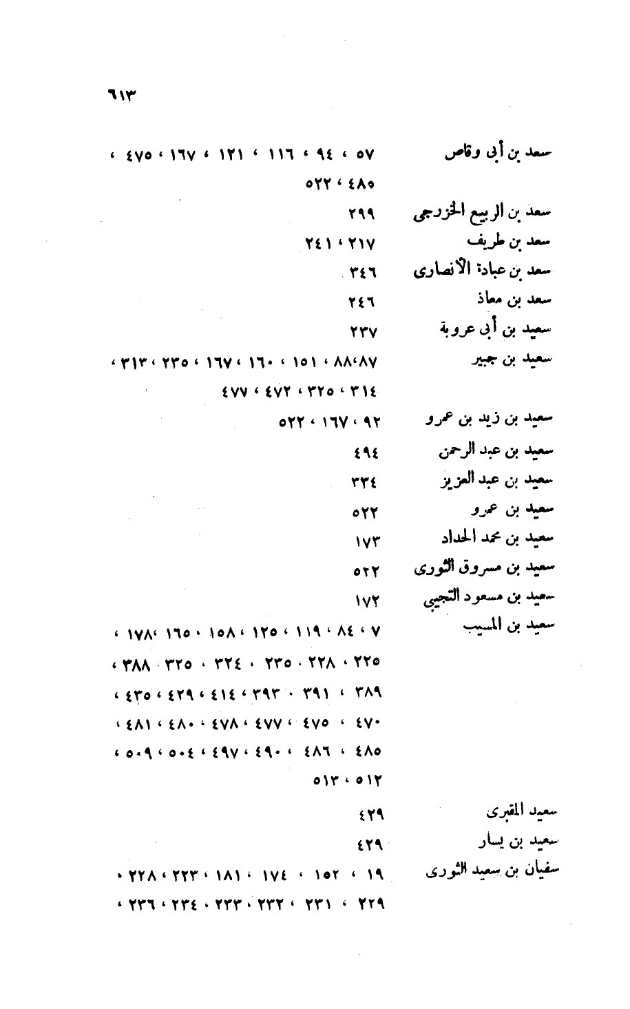 - سعيد بن المسيب: 7، 84، 119، 125، 158، 165، 178، 225، 228، 235، 324، 325، 388، 389، 391، 393، 414، 429، 435، 470، 475، 477، 478، 480، 481، 485، 486، 490، 497، 504، 509، 512، 513.