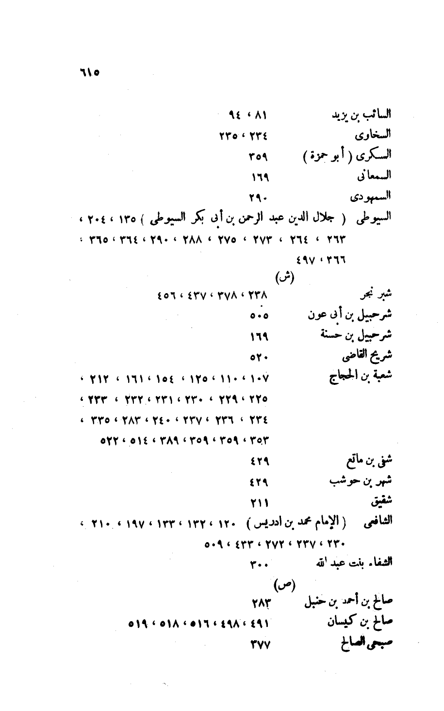 - السيوطي (جلال الدين عبد الرحمن بن أبي بكر السيوطي): 135، 204، 263، 264، 273، 275، 288، 290، 364، 365، 366، 497.