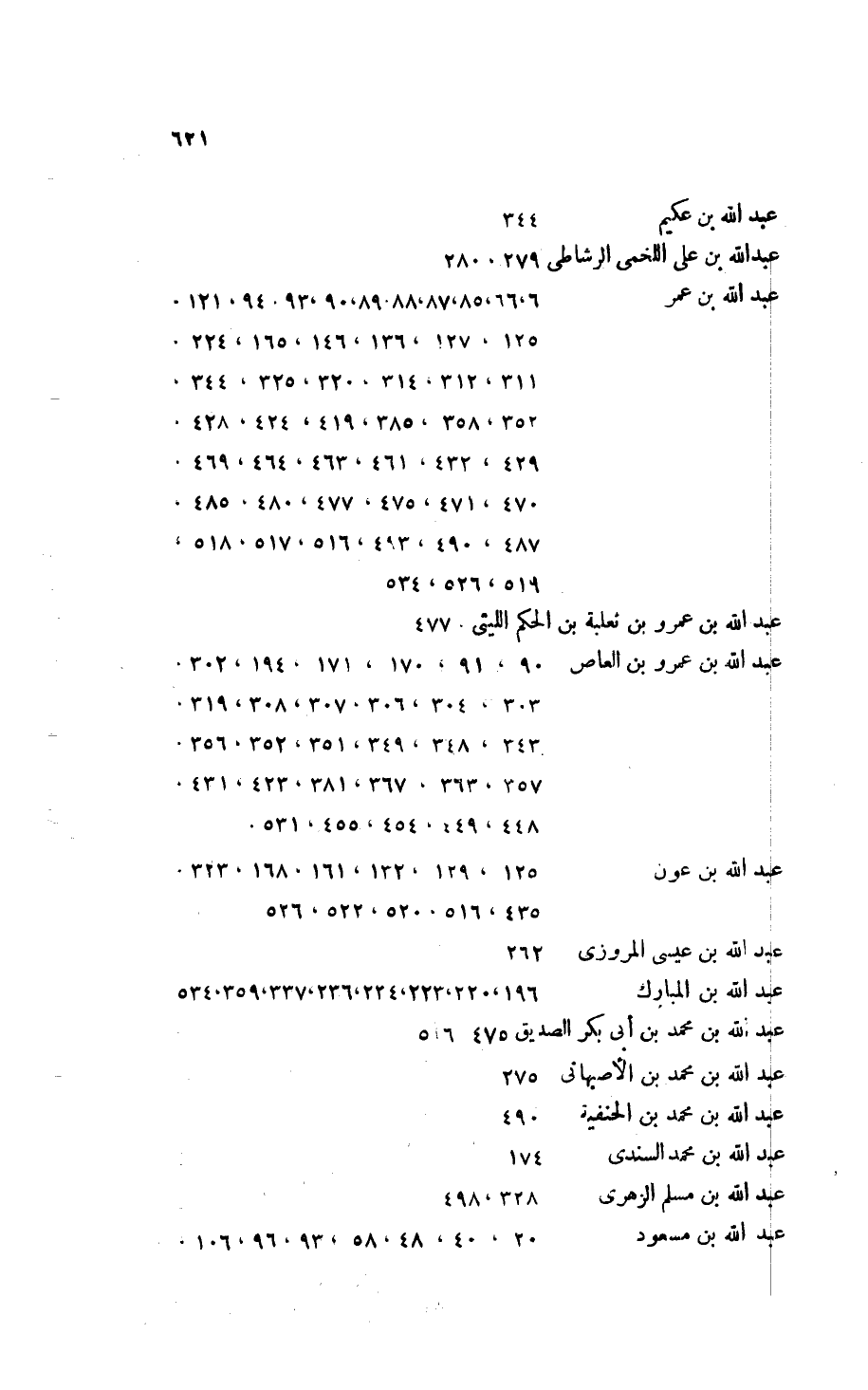 - عبد الله بن عمر: 6، 66، 85، 87، 88، 89، 90، 93، 94، 121، 125، 127، 136، 146، 165، 224، 311، 312، 314، 320، 325، 344، 352، 358، 385، 419، 424، 428، 429، 432، 461، 463، 464، 469، 470، 471، 475، 477، 480، 485، 487، 490، 493، 516، 517، 518، 519، 526، 534.