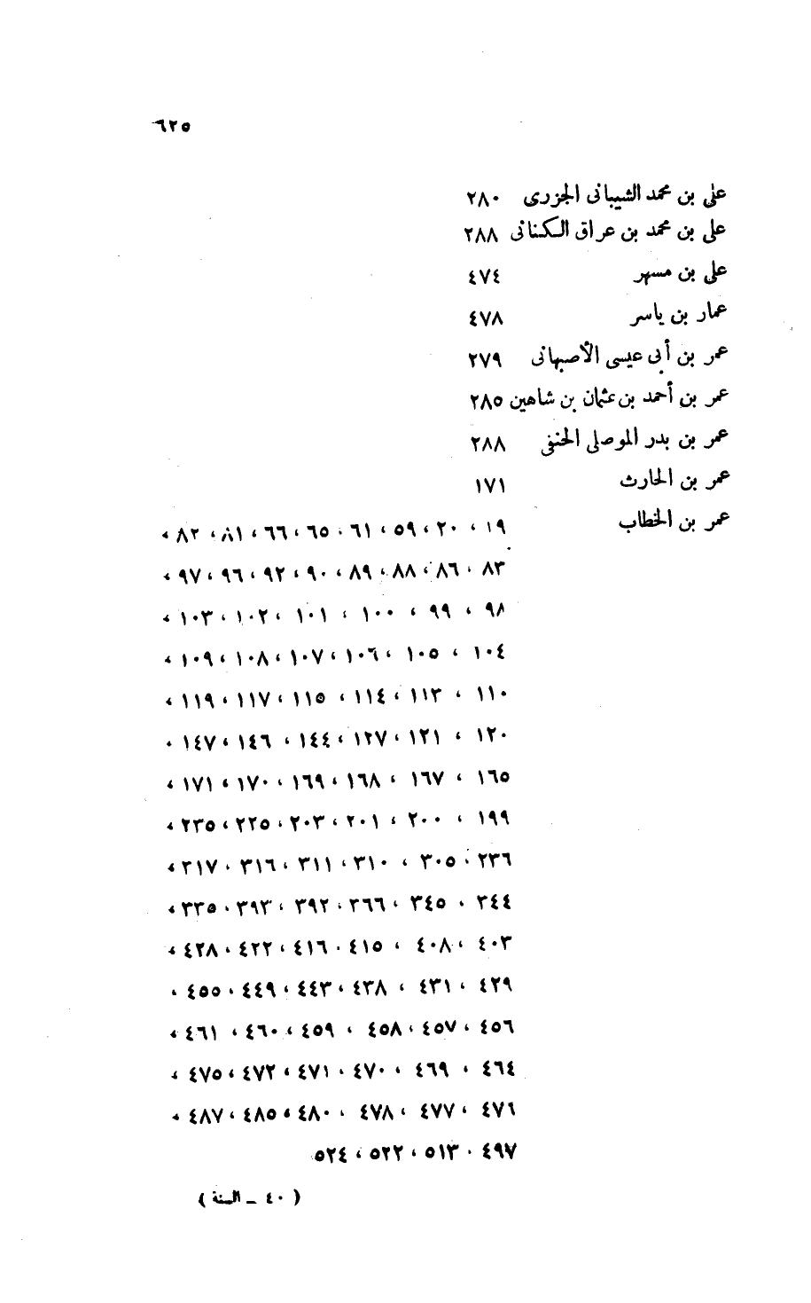 - عمر بن الخطاب: 19، 20، 59، 61، 65، 66، 81، 82، 83، 86، 88، 89، 90، 92، 96، 97، 98، 99، 100، 101، 102، 103، 104، 105، 106، 107، 108، 109، 110، 113، 114، 115، 117، 119، 120، 121، 127، 144، 146، 147، 165، 167، 168، 169، 170، 171، 199، 200، 201، 203، 225، 235، 236، 305، 310، 311، 316، 317، 344، 345، 366، 392، 393، 335، 403، 408، 415، 416، 422، 428، 429، 431، 438، 443، 449، 455، 456، 457، 458، 459، 460، 461، 464، 469، 470، 471، 472، 475، 476، 477، 478، 480، 485، 487، 497، 513، 522، 524.