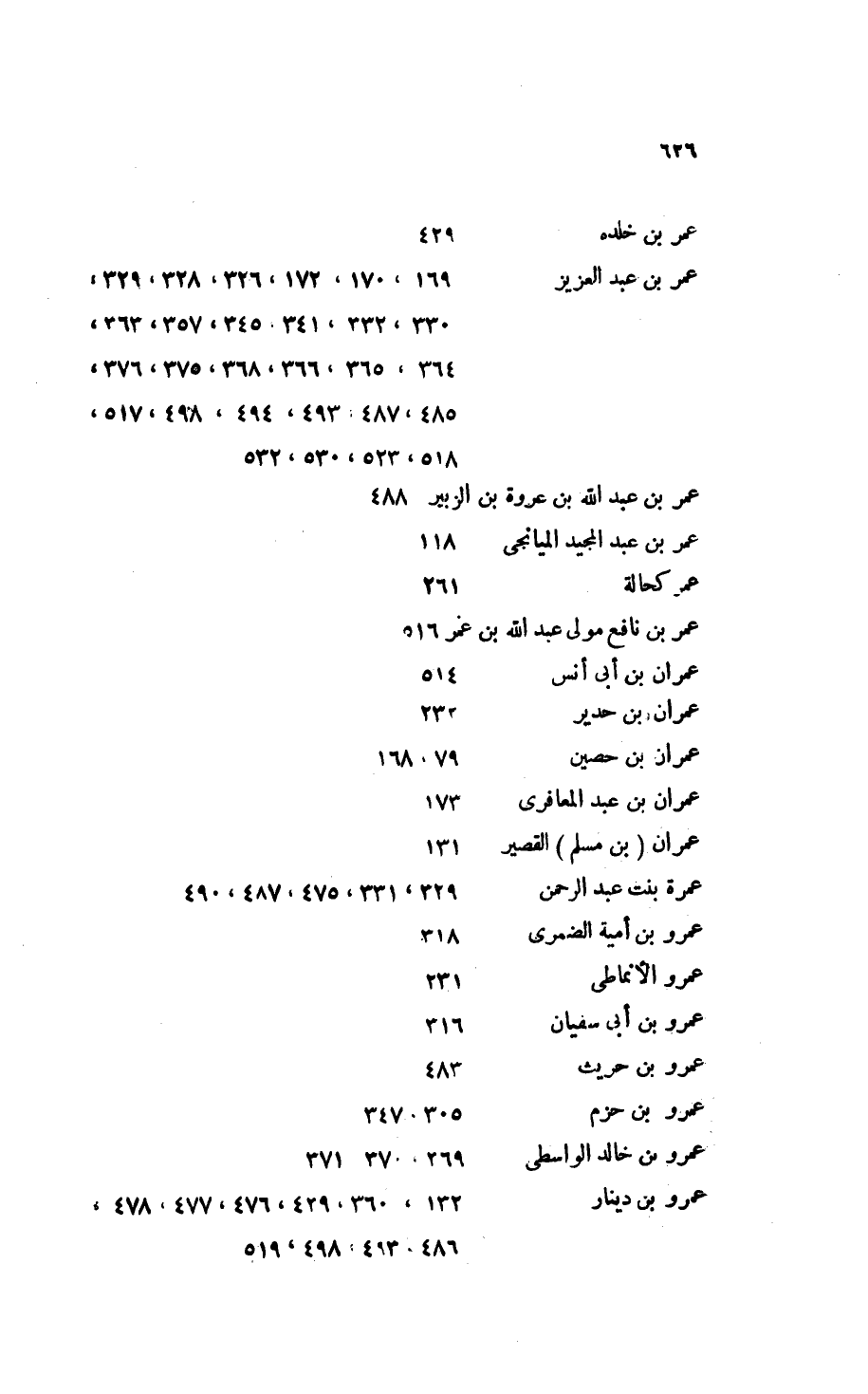 - عمر بن عبد العزيز: 169، 170، 172، 326، 328، 329، 330، 332، 341، 345، 357، 363، 364، 365، 366، 368، 375، 376، 485، 487، 493، 494، 498، 517، 518، 523، 530، 532.