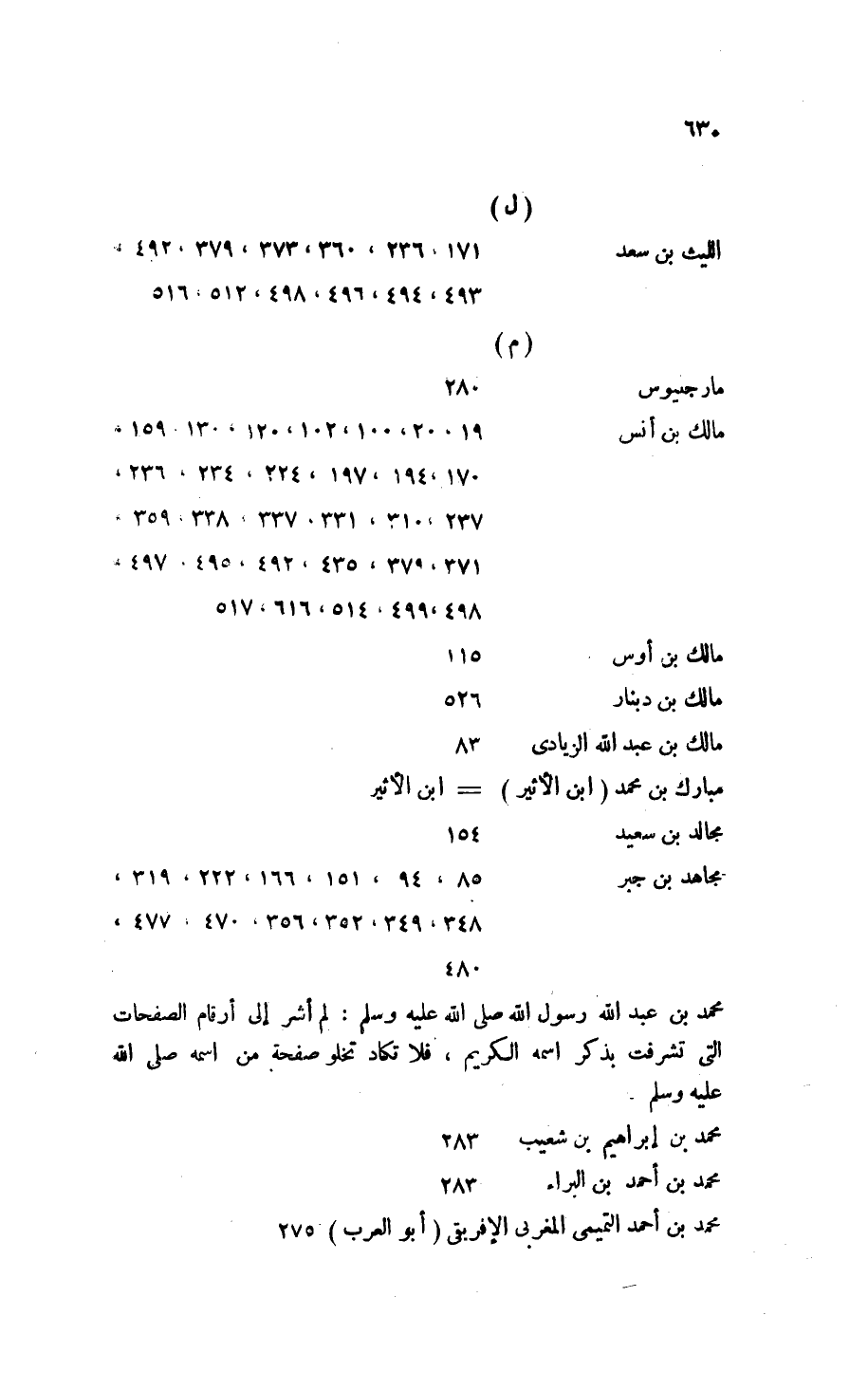 - مالك بن أنس: 19، 20، 100، 102، 120، 130، 159، 170، 194، 197، 224، 234، 236، 237، 310، 331، 337، 338، 359، 371، 379، 435، 492، 495، 497، 498، 499، 514، [516]، 517.