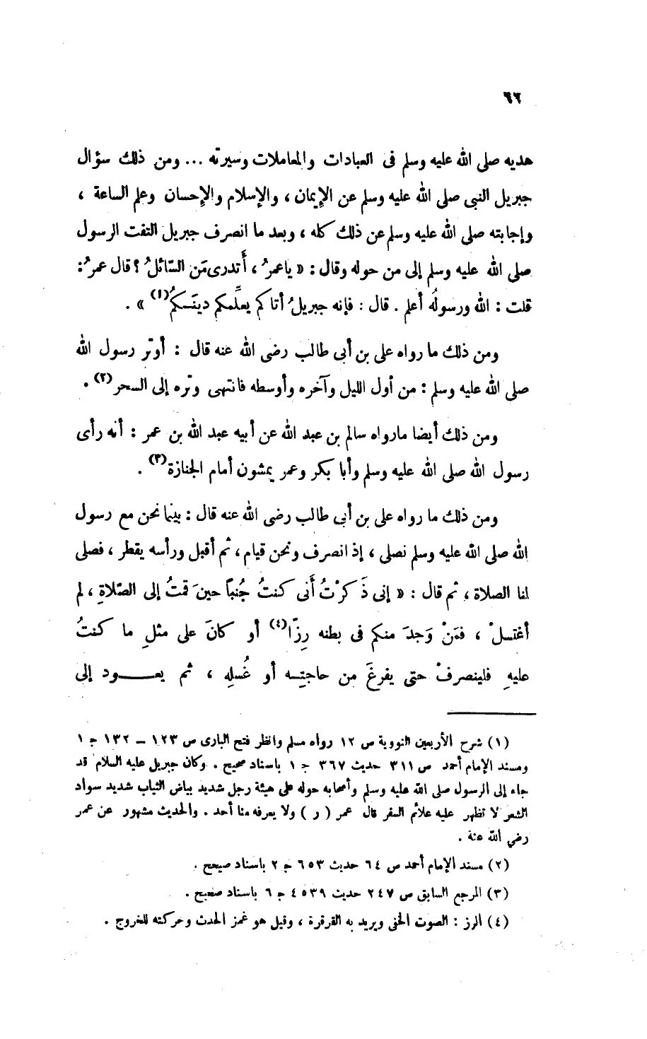 (¬1) " شرح الأربعين النووية ": ص 12 رواه مسلم وانظر " فتح الباري ": ص 123 - 132 جـ 1 و " مسند الإمام أحمد " ص 311 حديث 367 جـ 1 بإسناد صحيح. وكان جبريل - عَلَيْهِ السَّلاَمُ - قد جاء إلى الرسول - صَلََّى اللهُ عَلَيْهِ وَسَلَّمَ - وأصحابه حوله على هيئة رجل شديد بياض الثياب شديد سواد الشعر لا تظهر عليه علائم السفر قال عمر - رَضِيَ اللهُ عَنْهُ - ولا يعرفه منا أحد. والحديث مشهور عن عمر - رَضِيَ اللهُ عَنْهُ -.