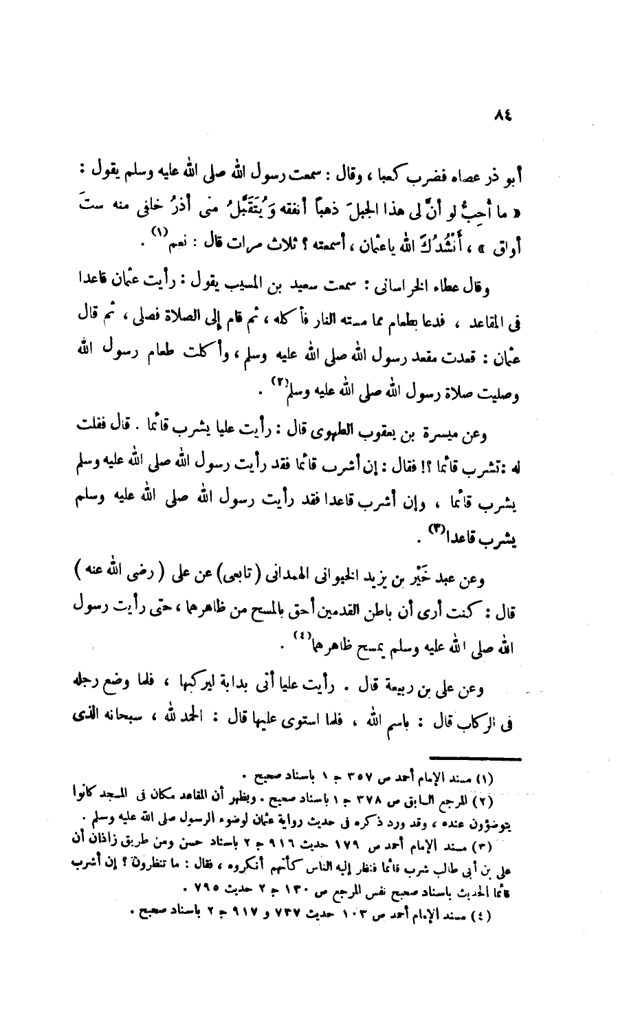 (¬3) " مسند الإمام أحمد ": ص 179 حديث 916 جـ 2 بإسناد حسن ومن طريق زَاذَان، أَنَّ عَلِيَّ بْنَ أَبِي طَالِبٍ، شَرِبَ قَائِمًا، فَنَظَرَ إِلَيْهِ النَّاسُ كَأَنَّهُمْ أَنْكَرُوهُ، فَقَالَ: «مَا تَنْظُرُونَ؟ إِنْ أَشْرَبْ قَائِمًا»، الحديث بإسناد صحيح، نفس المرجع: ص 130 جـ 2 حديث 795.